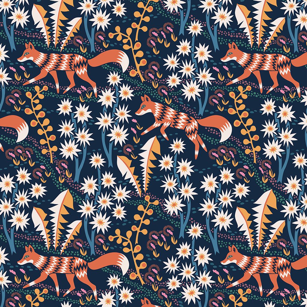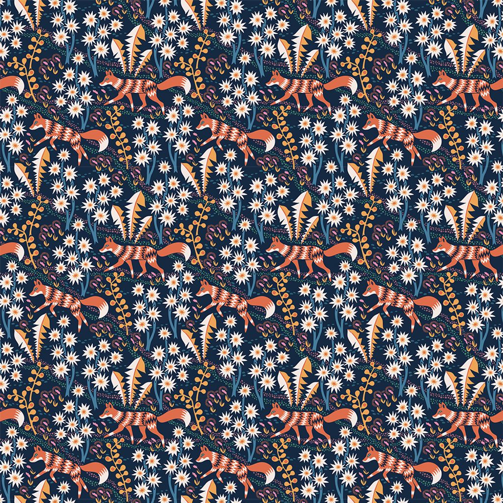 Ett underbart mönster med rävar och växter. Mönstret är tryckt på Arvidssons klassiska bomullsvara. Passar lika bra i hemmet som på kontoret. Bild nr. 2 visar mönstret på hela tygets bredd.