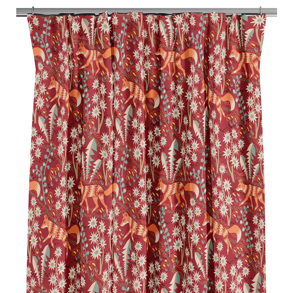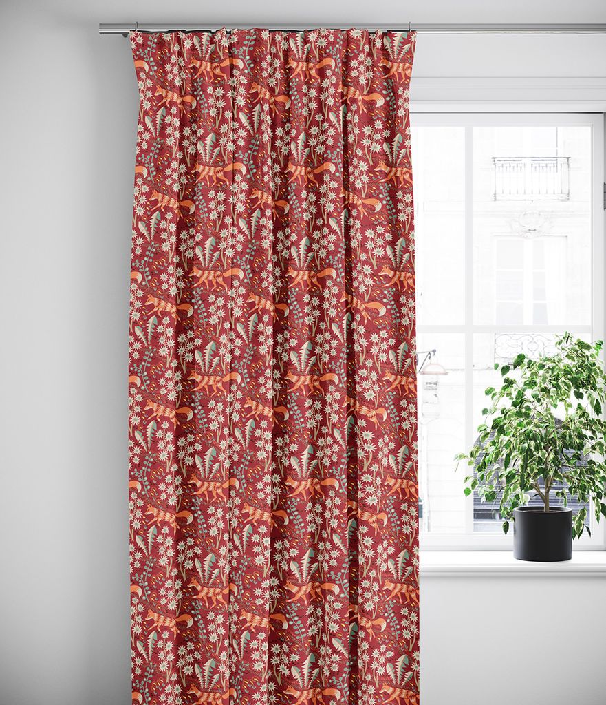 Tryckta röda gardiner med mönster av orange rävar och blommor och blad. Ouppfållade med overlocksöm nedtill. Längderna finns i måtten 240cm och 295cm.