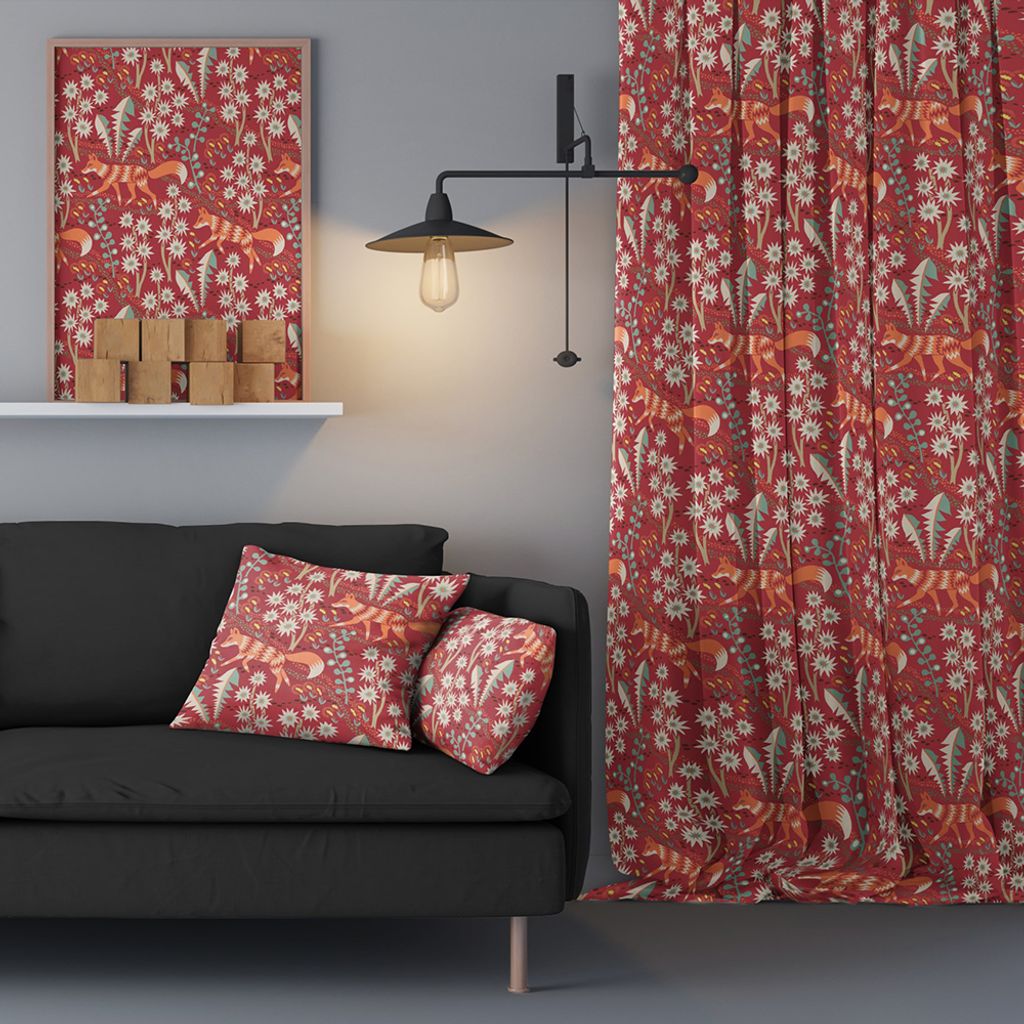 Röda gardiner med mönster av orange rävar och blommor och blad.