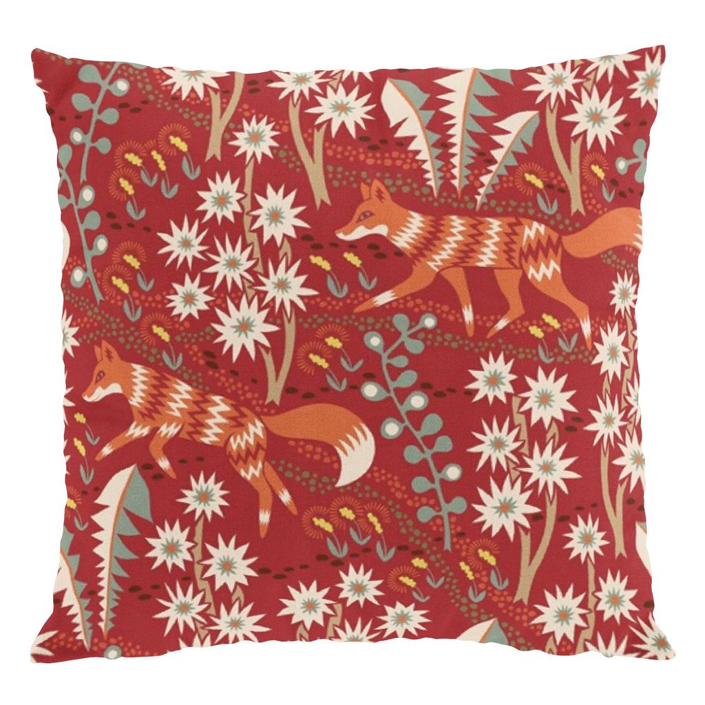 Ett kuddfodral i mönstret Stjärnspeja röd med rävar och växter från Arvidssonstextil. Fodralet är 47x47cm med ett blixtlås i nederkant. Kuddfodral tas 3st på tygets bredd och kan därför skilja sig åt.