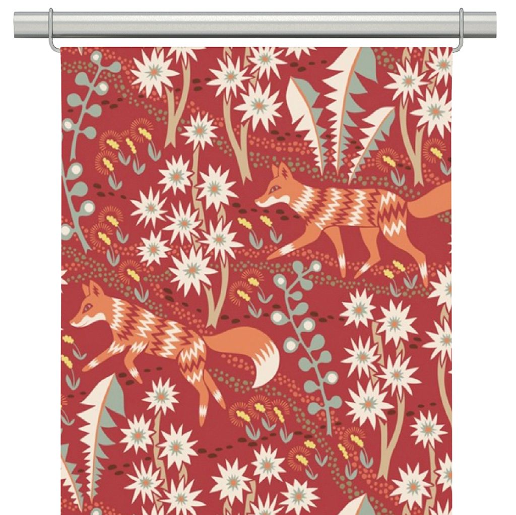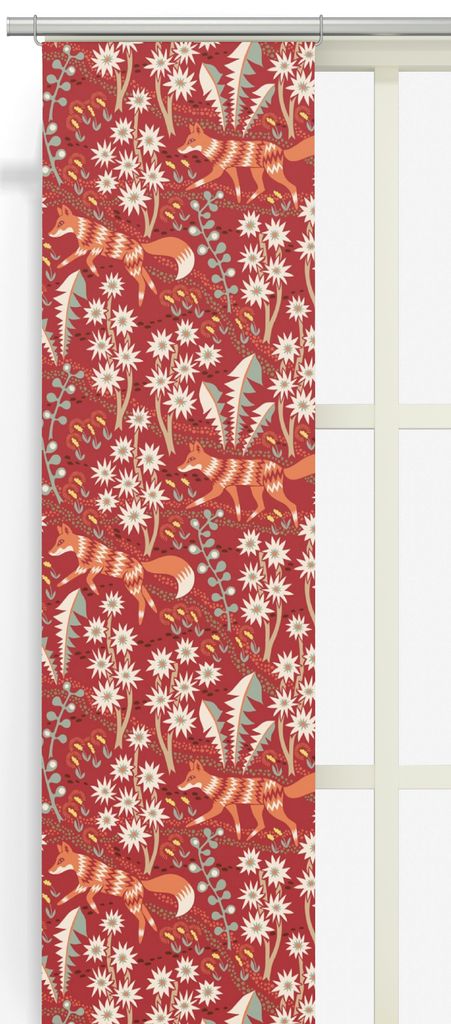 Röda panelgardiner med rävar och växter i orange, turkos och vitt