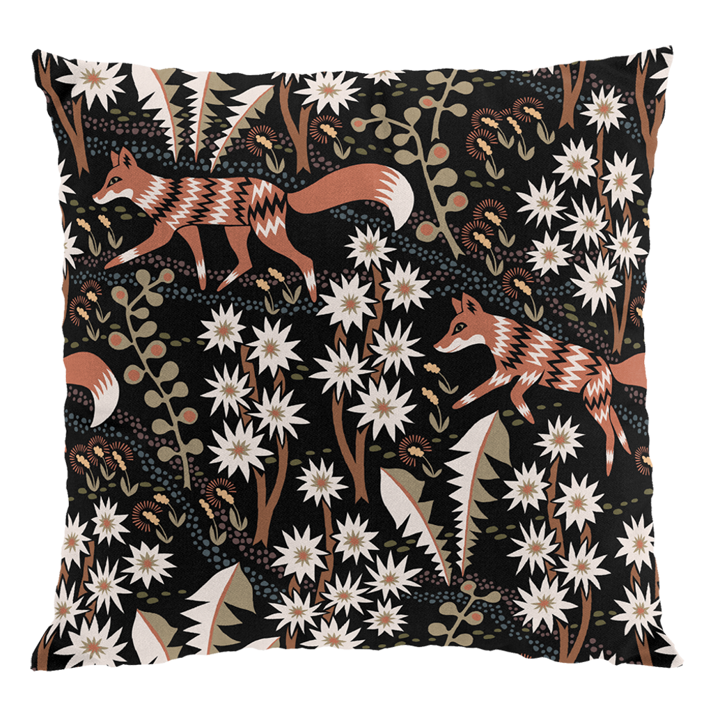 Ett kuddfodral i mönstret Stjärnspeja svart med rävar och växter från Arvidssonstextil. Fodralet är 47x47cm med ett blixtlås i nederkant. Tillverkat i Estland. Kuddfodral tas 3st på tygets bredd och kan därför skilja sig åt.