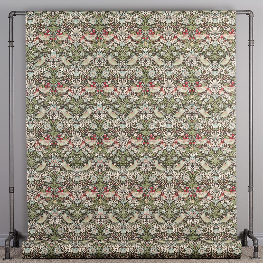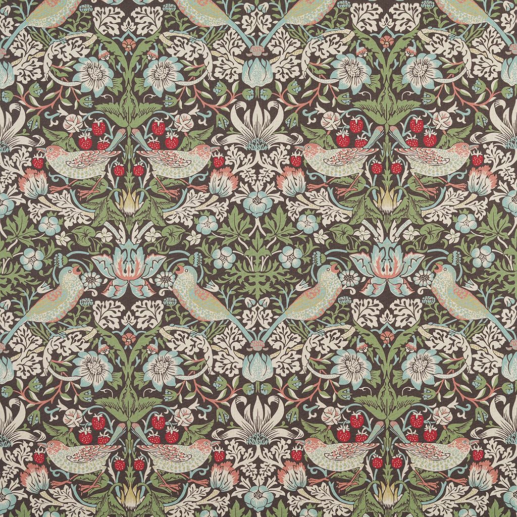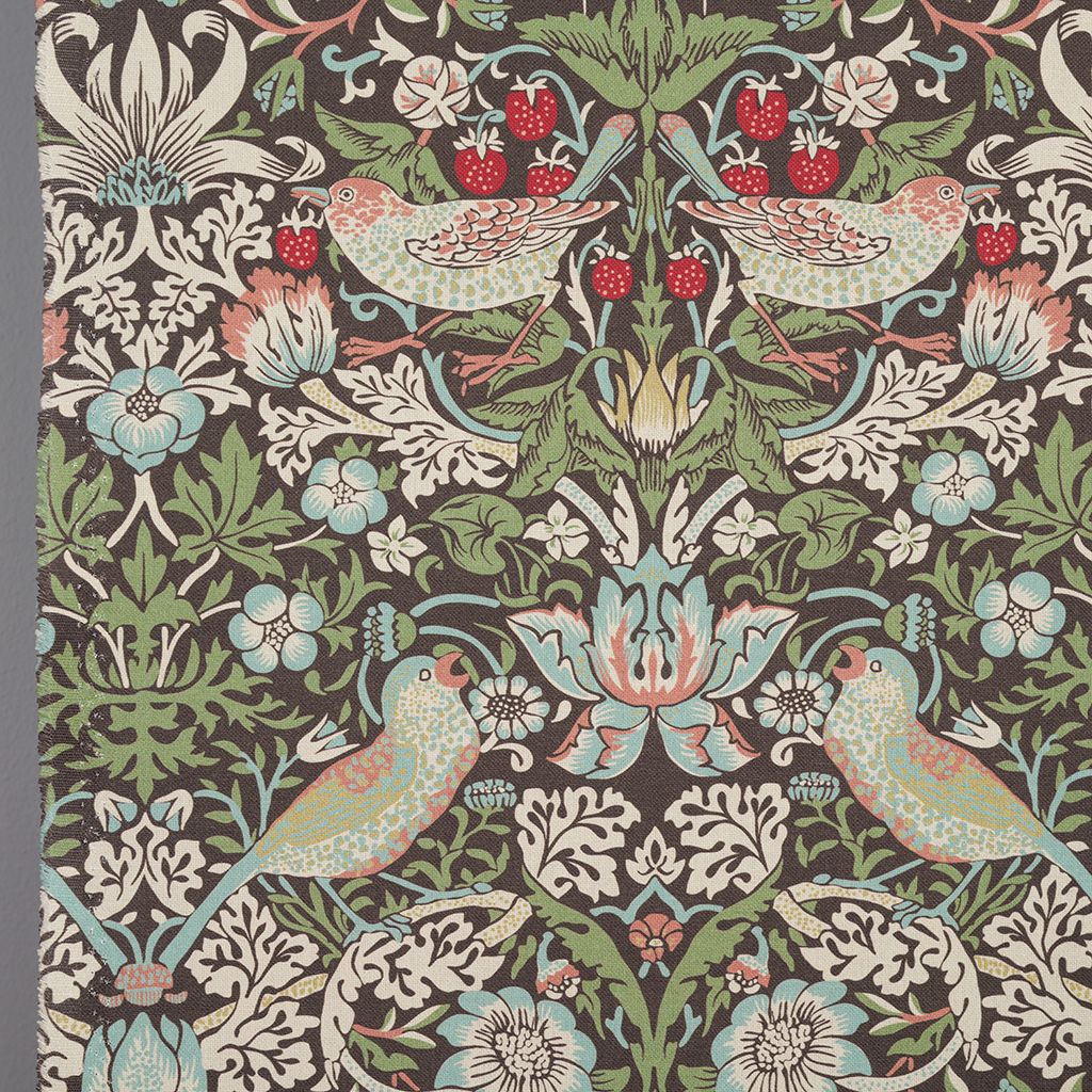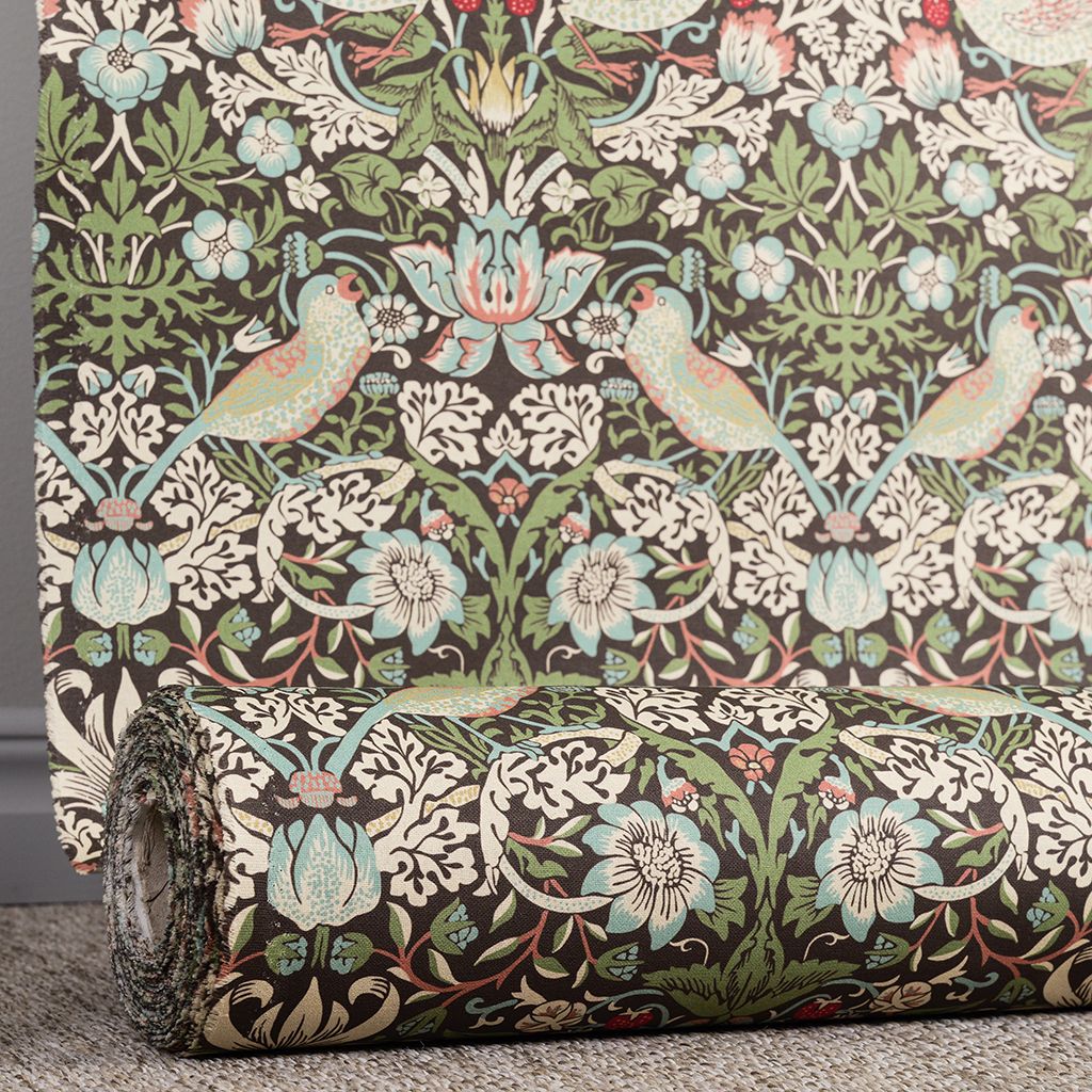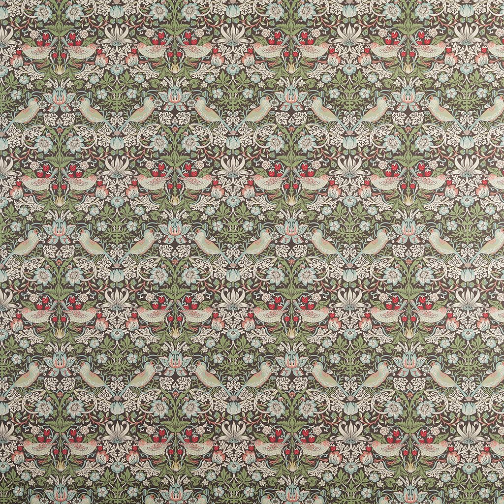 Tyg med Morris inspirerat mönster i grön-blå toner med klassiska fåglar, blommor och jordgubbar. Strawberry Bird ger en livfull och tidlös känsla inspirerad av klassisk engelsk design.