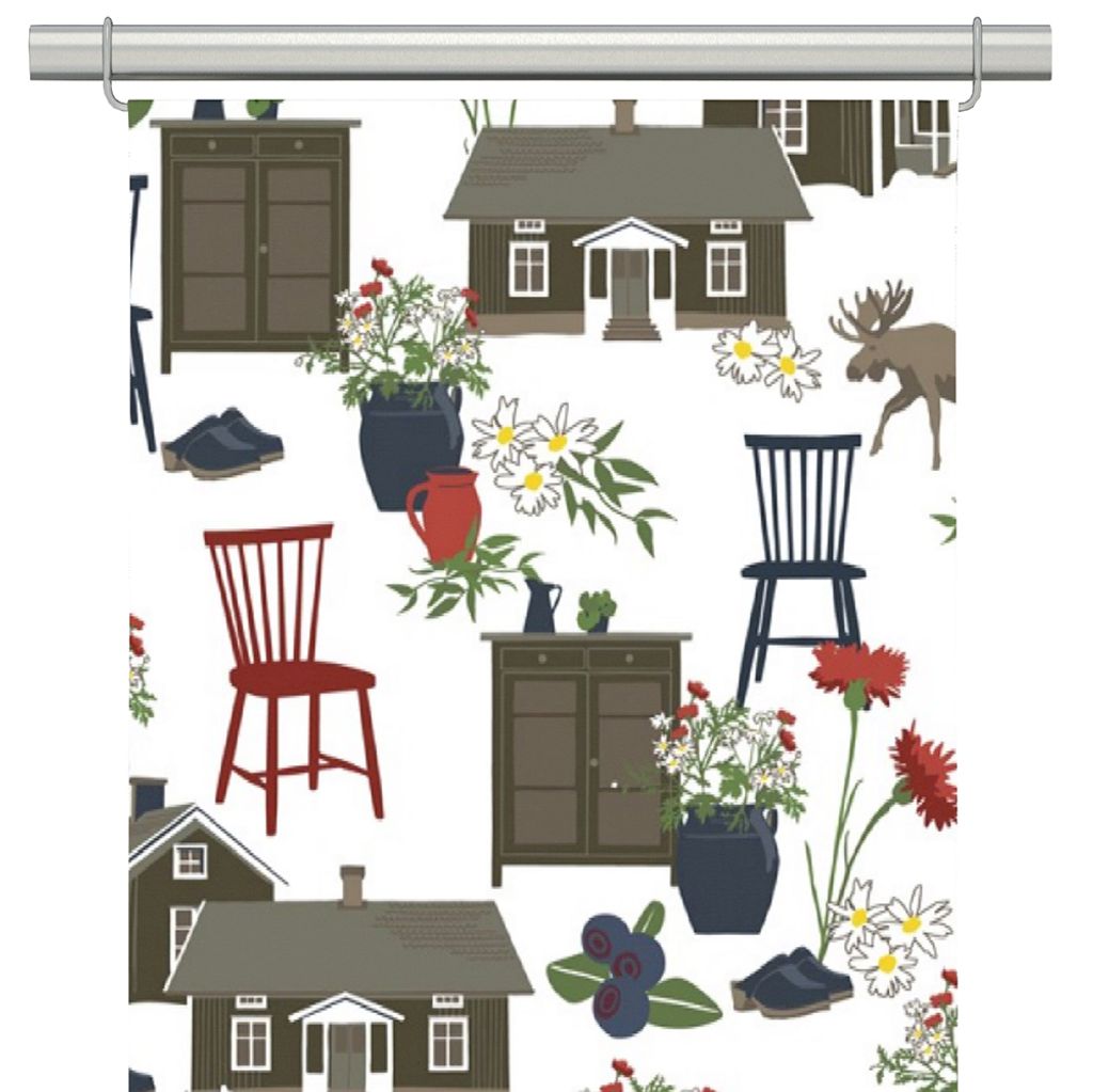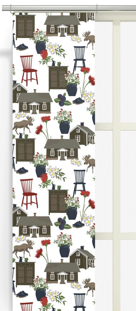 Vackra mönstret Strövtåg motiv av hus och inredning tar tankarna till Dalarna och Hälsingland med dom fina husen, träskor, pinnstolar, älg, bär och blommor. Ofållad nederkant med overlocksöm.