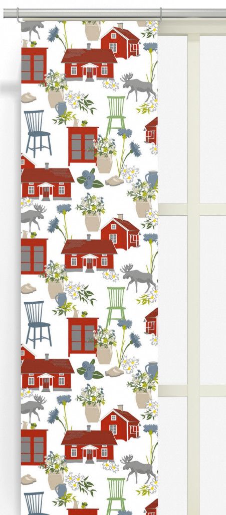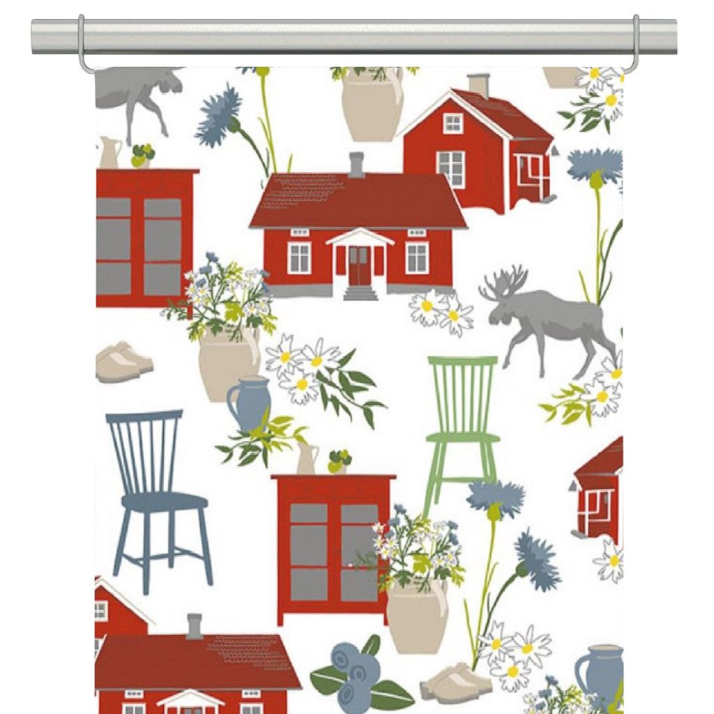 Mönstret Strövtåg vit med ett mönster med faluröda stugor, pinnstolar och träskor från Arvidssons textil