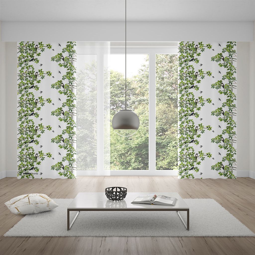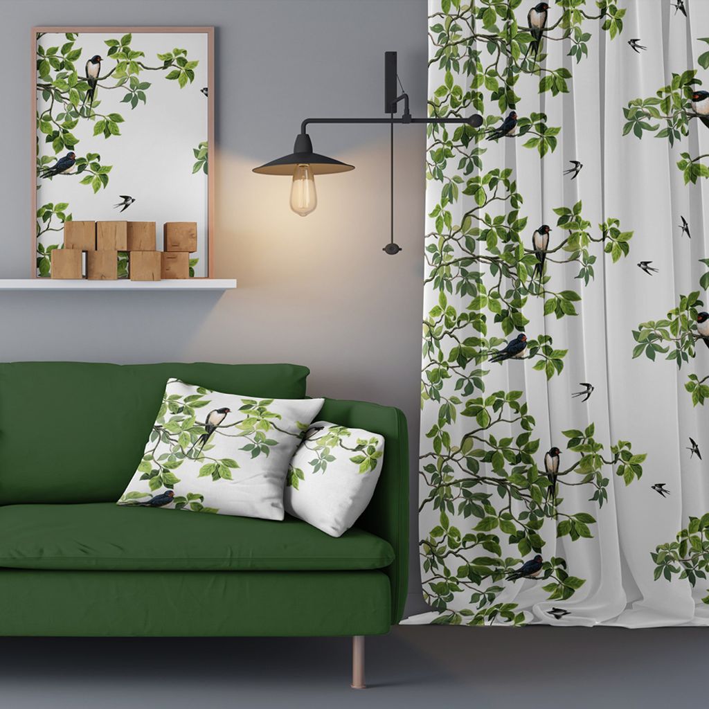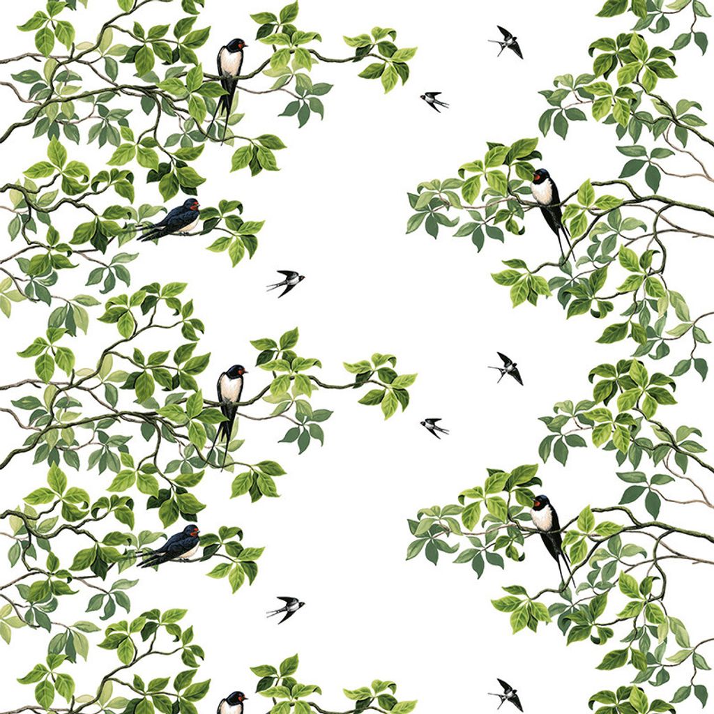 Bomullstyg med offwhite botten och lövträd med flygande svalor.