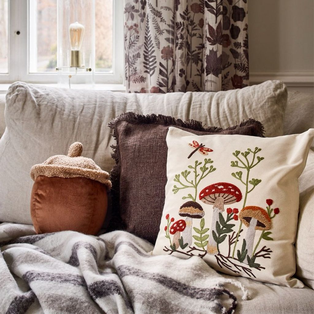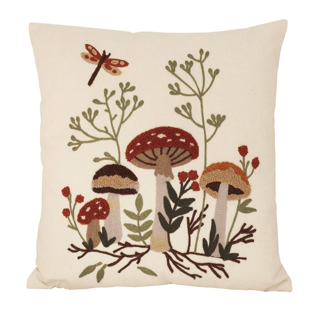 Låt naturen flytta in i ditt hem med Svampskogen kuddfodral. Det broderade motivet föreställer ett vackert skogslandskap med olika svamparter, grenar och blad, och en liten trollslända som svävar ovanför – allt i varma jordnära färger som skapar ett hemtrevligt intryck. Kuddfodralet är tillverkat i en robust och mjuk bomullsblandning med fin struktur, vilket ger både hållbarhet och komfort.