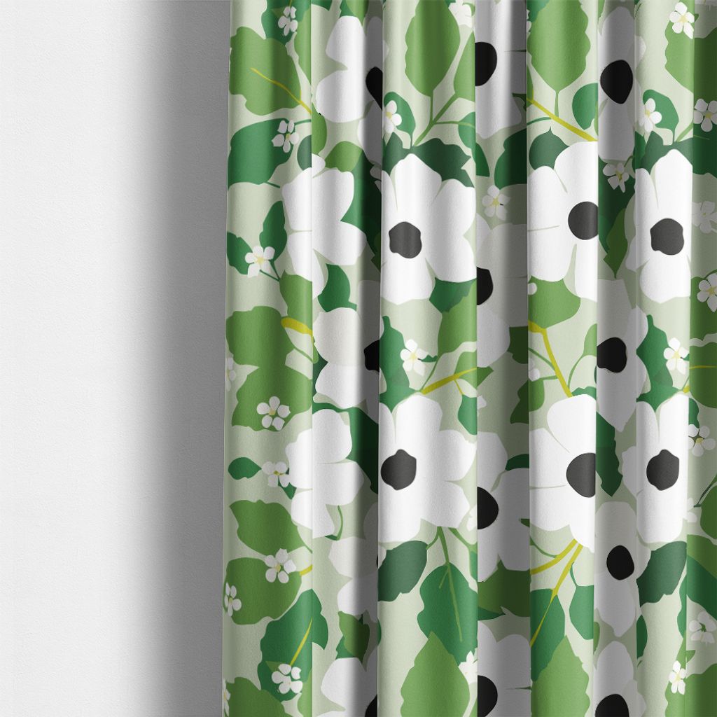 Beskrivning av Svartöga grön – blommiga gardiner med vita blommor och gröna blad