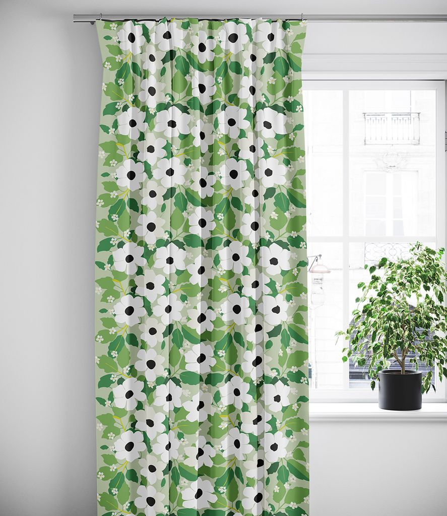 Svartöga grön gardiner är ett mönstrat alternativ för dig som vill ge rummet mer karaktär och färg. Det täta blommönstret består av stora vita blommor med mörka mittpunkter, omgivna av blad i flera gröna nyanser. Mönstret skapar ett levande intryck samtidigt som färgskalan känns harmonisk och lätt att kombinera med både ljusa och neutrala inredningar.
