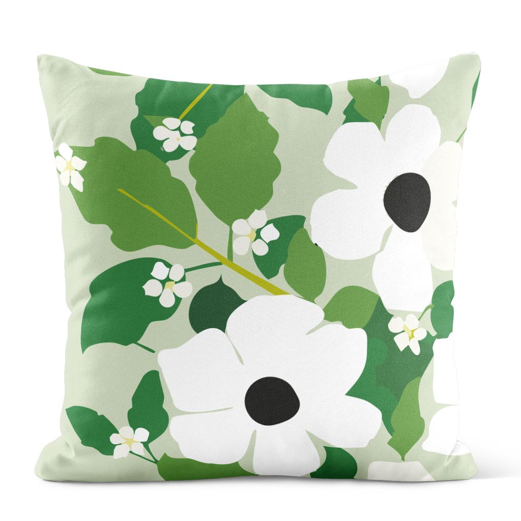 Solöga grön kuddfodral är ett livfullt och stilrent tillskott till din inredning, där naturens former står i fokus. Det grafiska blommönstret består av stora vita blommor med mörka mittpunkter, omgivna av blad i olika nyanser av grönt – från djup skogsgrön till ljusare, nästan limefärgade toner.