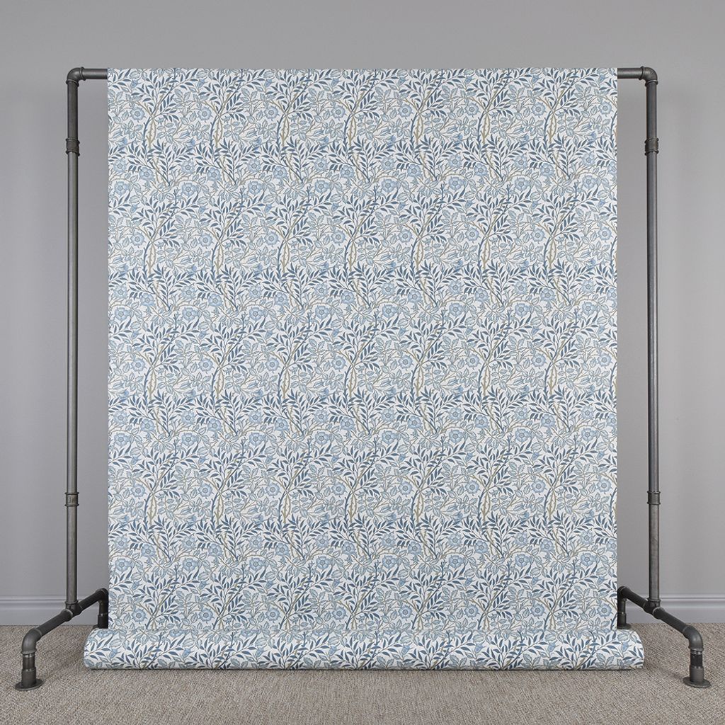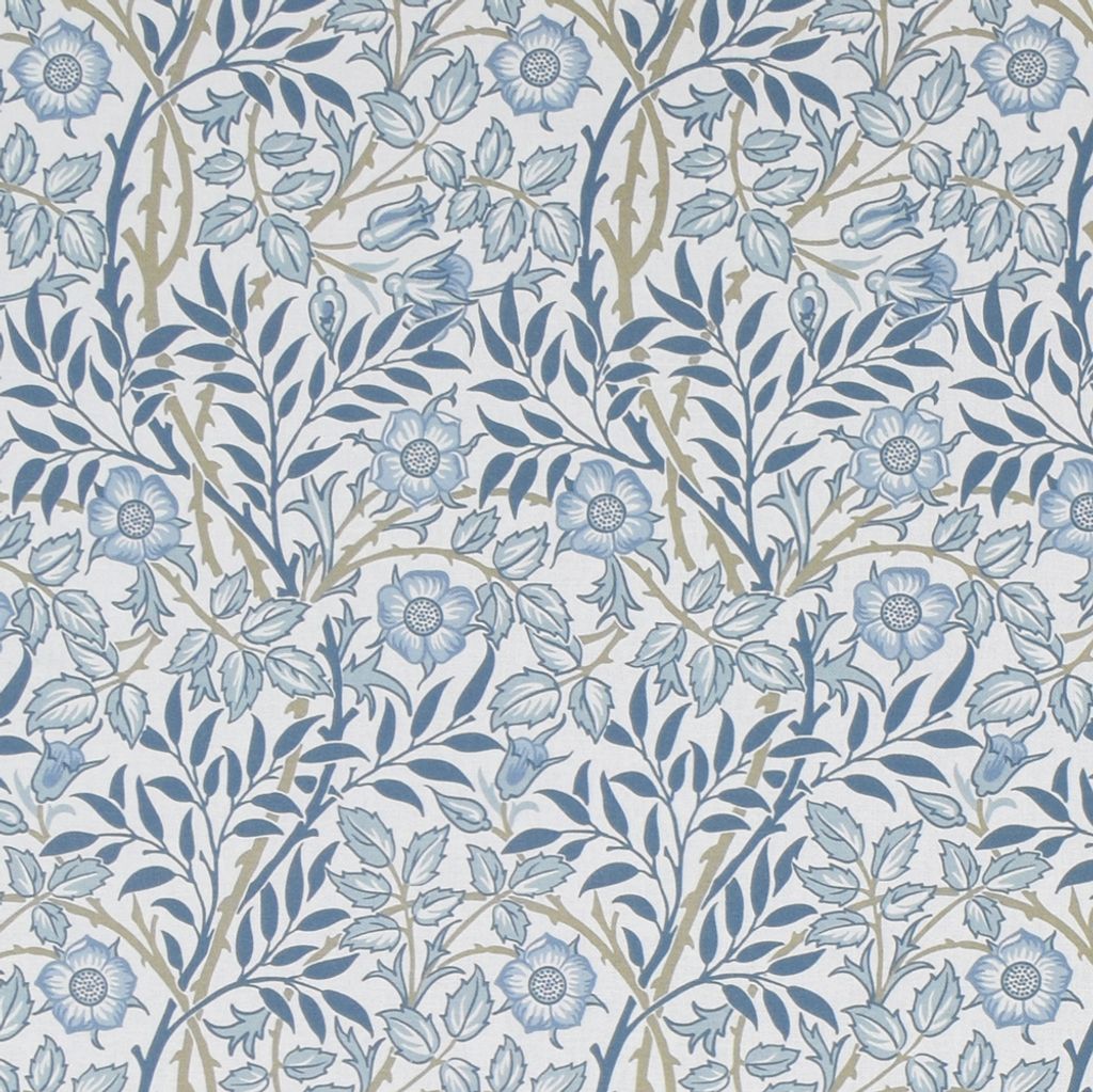 Tryckt tyg med offwhite botten och blommigt och blad mönster i blått och beige för gardiner, inredning och lättare möbelklädnad.