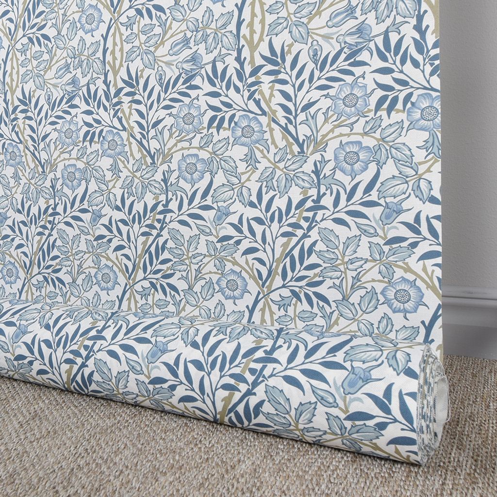 med motiv av blå blommor, blad och kvistar.