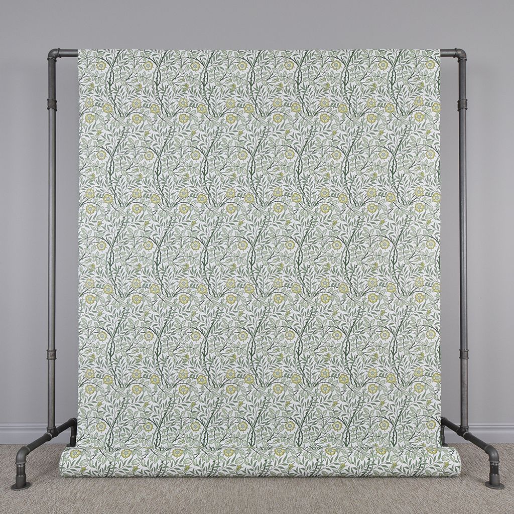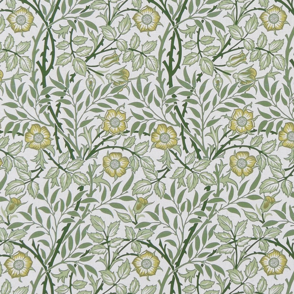 Tryckt tyg med offwhite botten och blommigt och blad mönster i grönt för gardiner, inredning och lättare möbelklädnad.