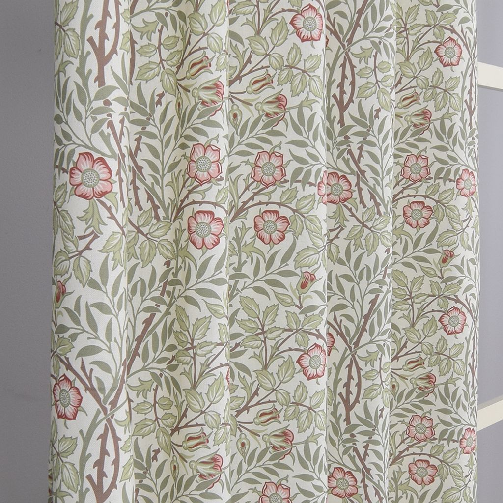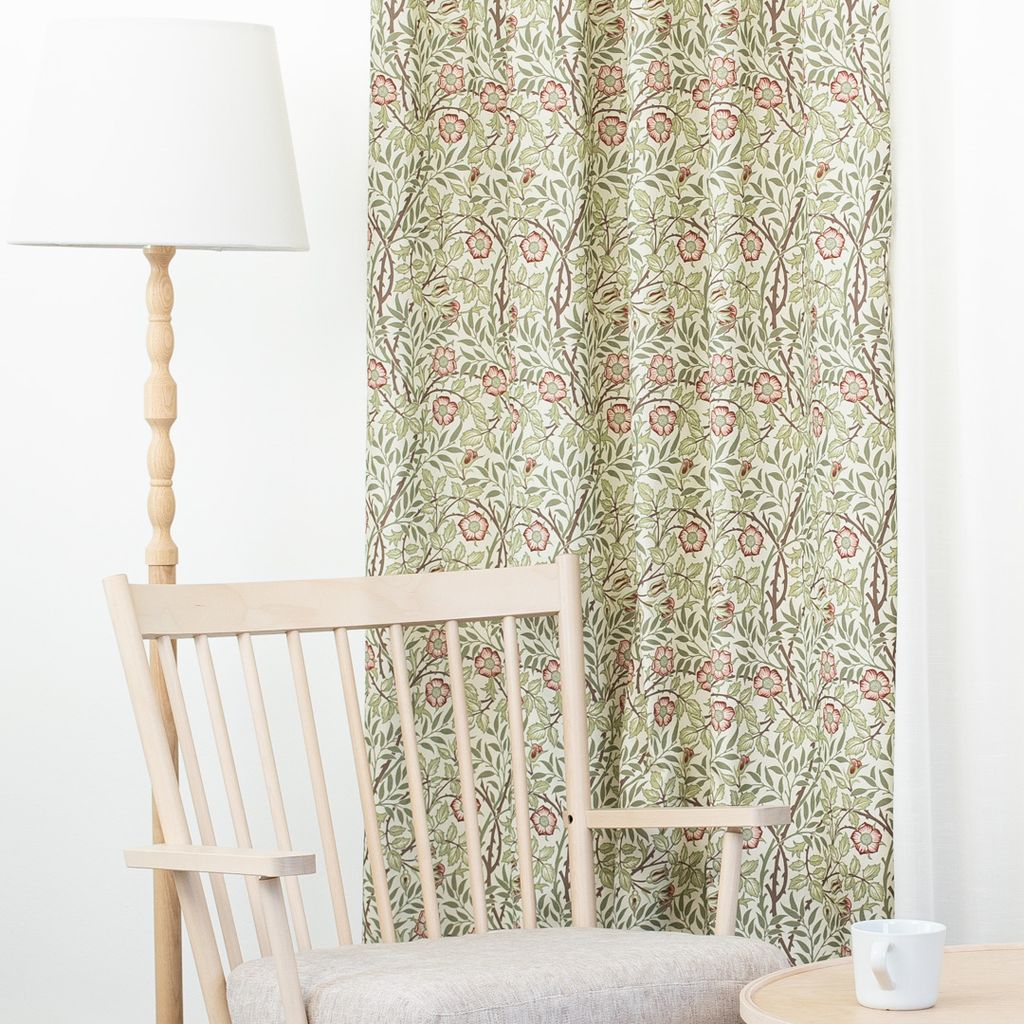 Gardiner med creme botten, blommor, blad och snirkligt mönster i rosa, gult och grönt.