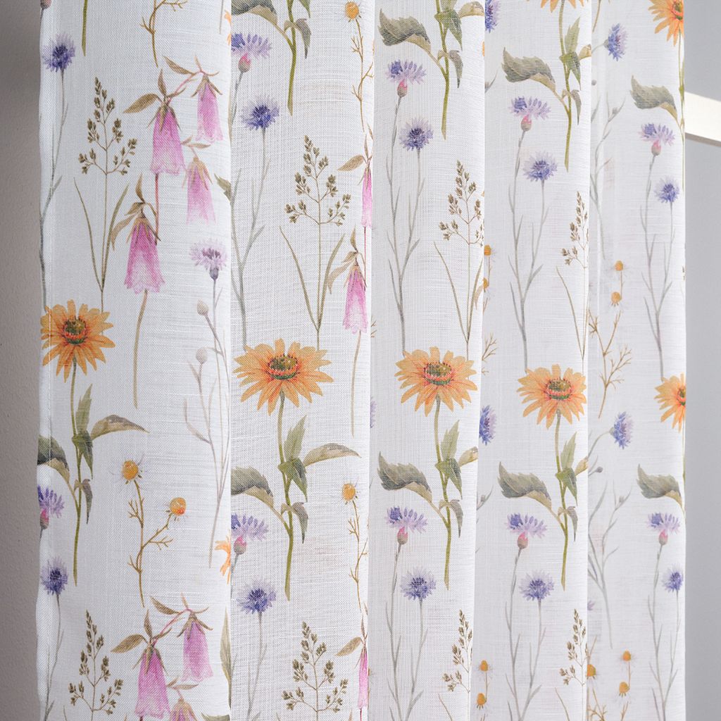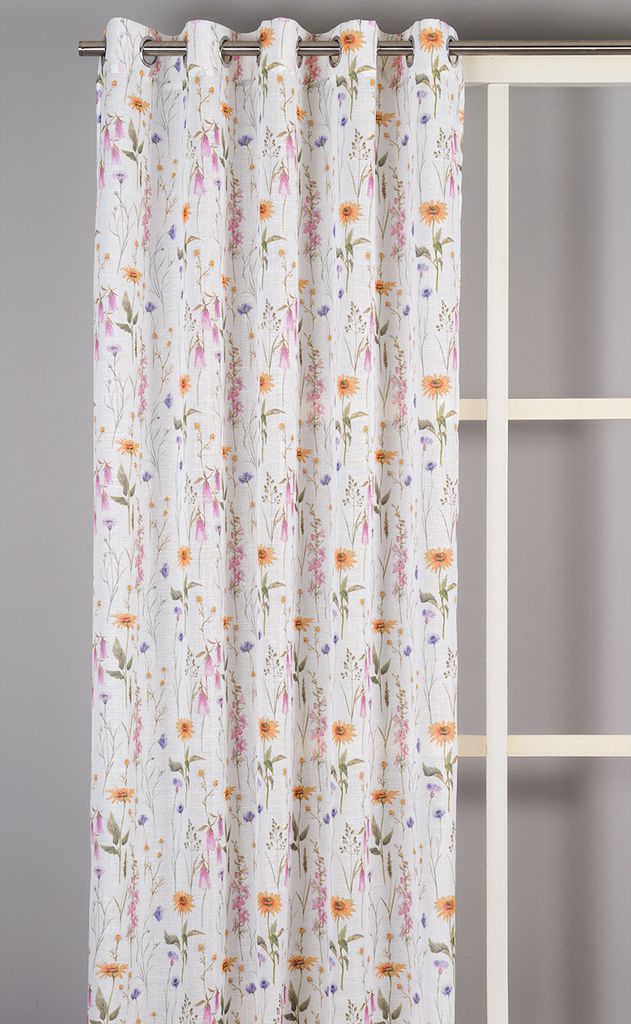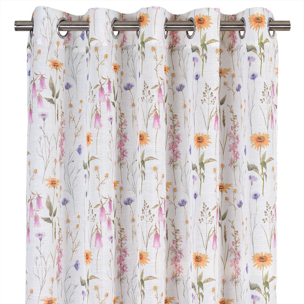 Designen består av ett fint och detaljrikt motiv inspirerat av naturen, där flera färger samspelar på ett elegant sätt. Toner av rosa, orange, lila och grönt ger gardinen en lätt och somrig karaktär som passar perfekt i både sovrum, vardagsrum och kök.