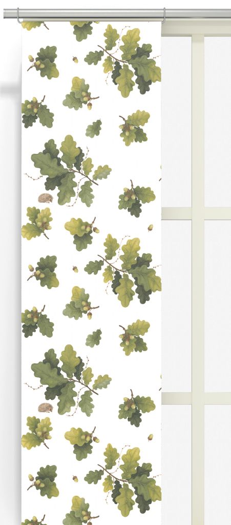 Taggad på äventyr panelgardiner fångar skogens rogivande känsla med ett mönster inspirerat av ekens kraftfulla blad och ekollon. Med en design som kombinerar mjuka gröna toner mot en ljus bakgrund, passar dessa gardiner utmärkt för att skapa en lugn och naturlig inredning. Tillverkade i 100% bomull, dessa panelgardiner är både sköna och hållbara, perfekta för att ge rummet en varm och inbjudande känsla.