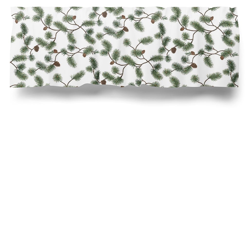 Gardinkappa på metervara med vit botten och tall kvistar i brunt och barr i grönt