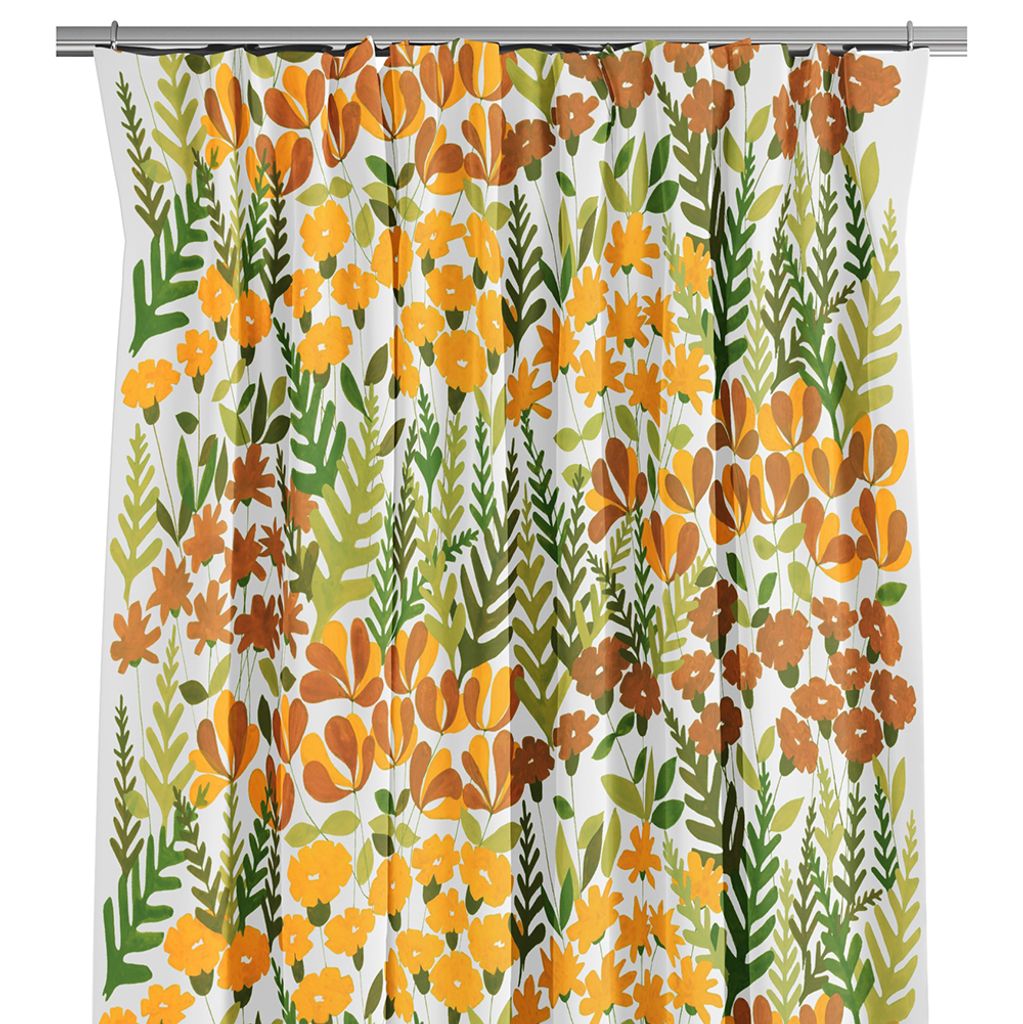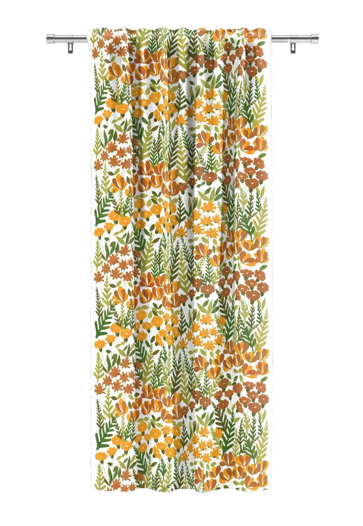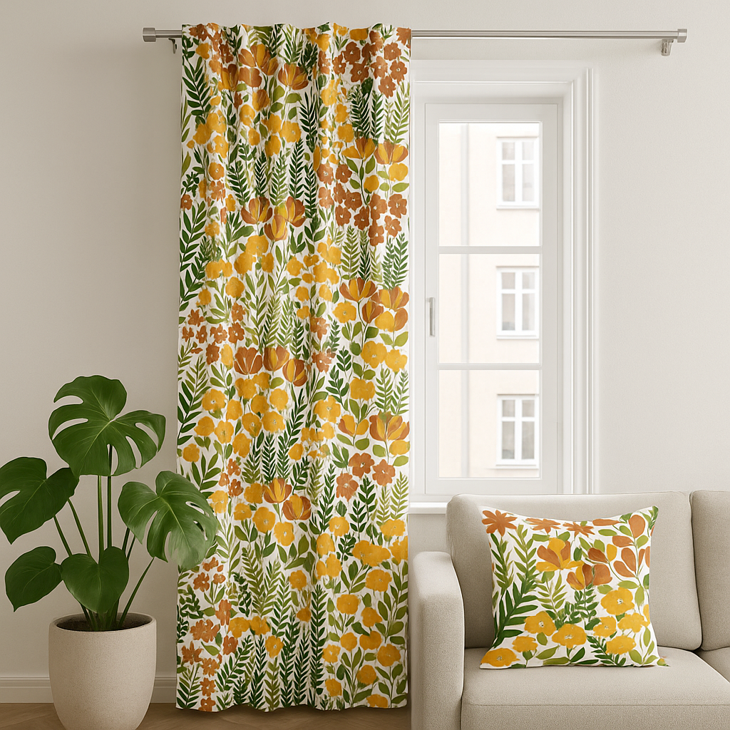 Låt hemmet blomma året om med Täppan gul gardiner, som tar intryck av sensommarens prunkande trädgårdar. Mönstret består av ett härligt myller av stiliserade blommor och frodiga bladverk i nyanser av solgult, rostrött och grönt, mot en vit bakgrund som ger tyget en fräsch och luftig känsla. Det är ett mönster som både känns naturligt och konstnärligt – med en lekfull penselföring som för tankarna till akvarell.