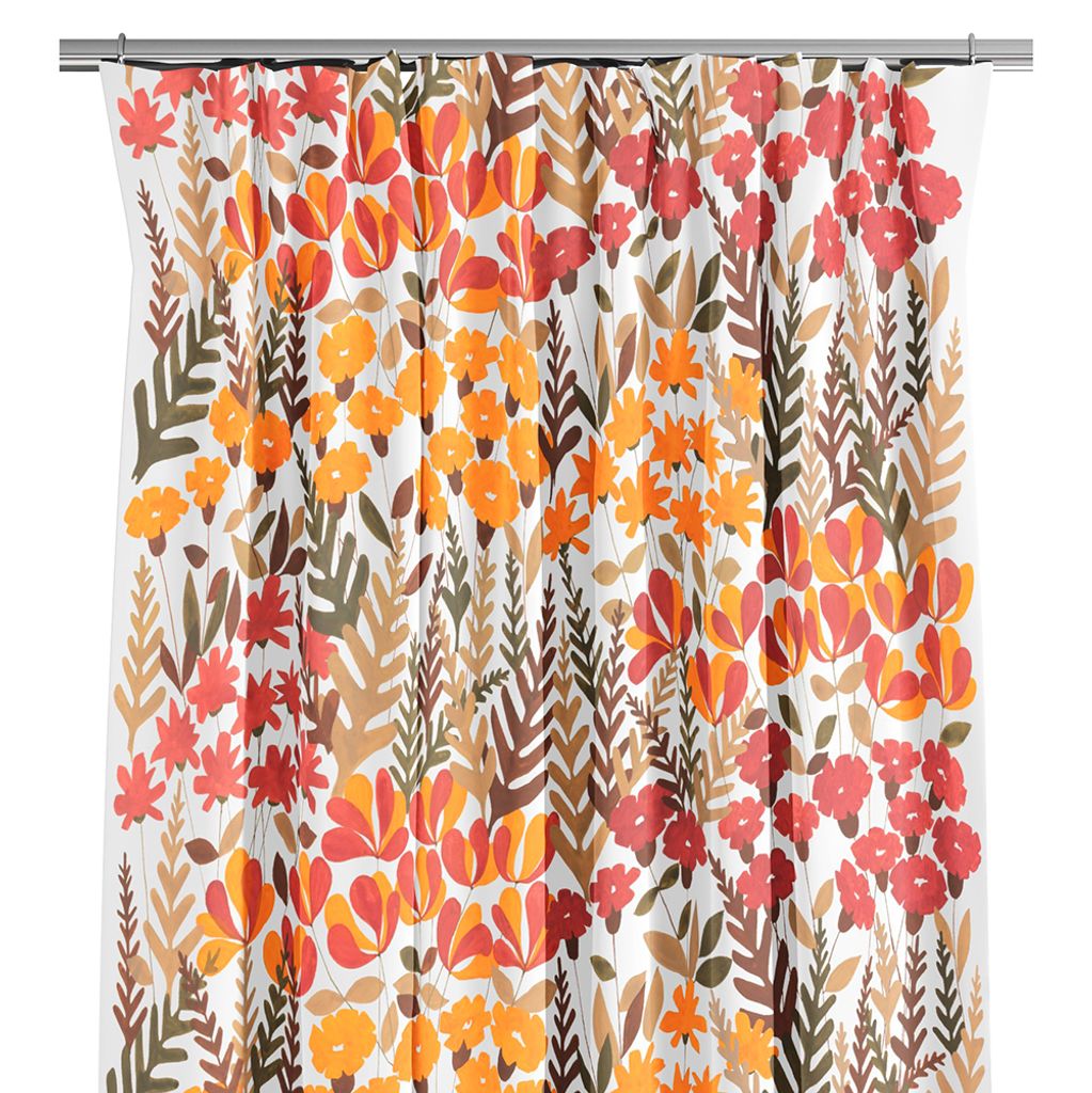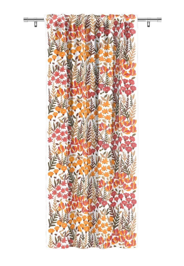 En varm och färgstark gardin fylld av blomsterprakt i rostiga nyanser av rött, orange och gulockra. Täppan rost är ett uttrycksfullt tyg som skapar en ombonad känsla i hemmet.