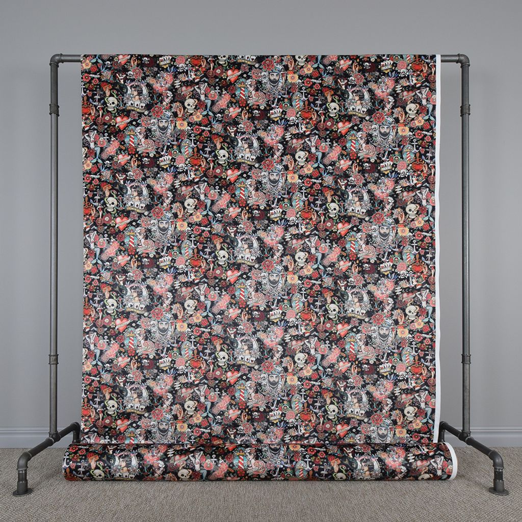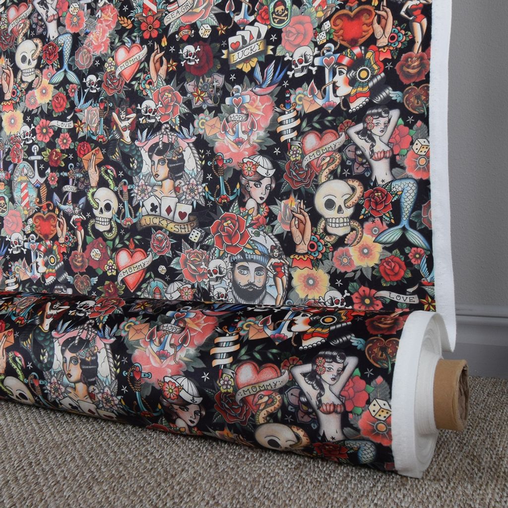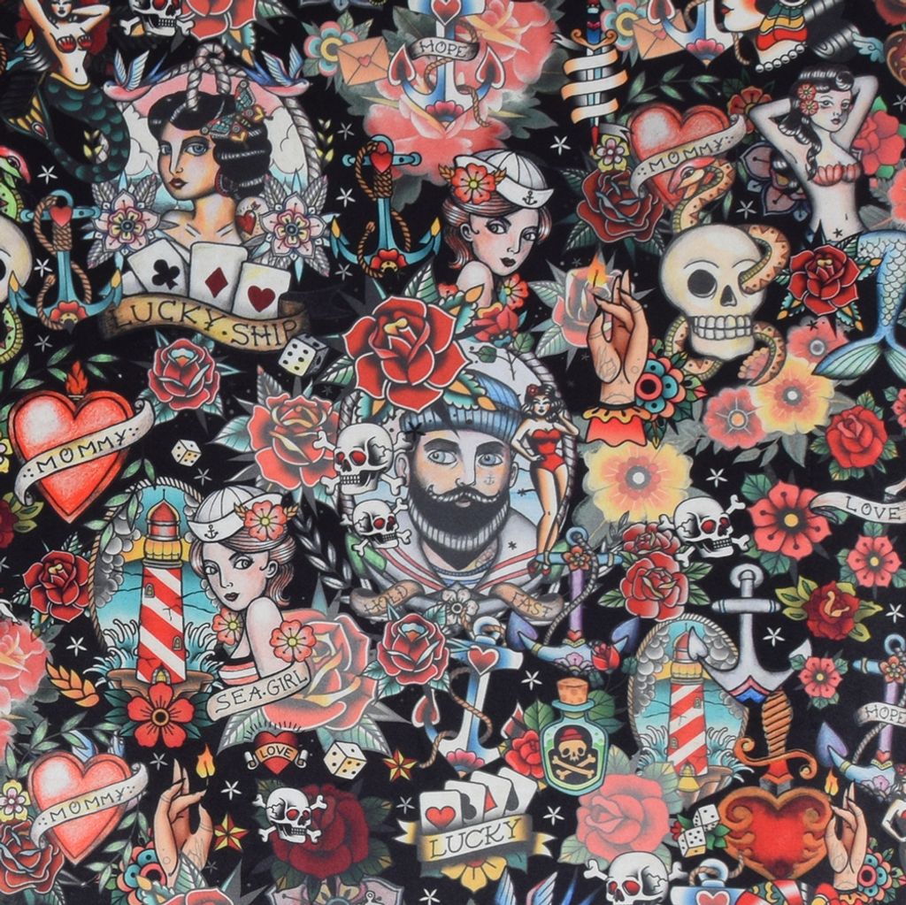 Låt dig inspireras av den klassiska tatueringskonsten med detta unika och trendiga sammetstyg som ger en lyxig känsla. Tyget är perfekt för gardiner, kuddar, låt inte kreativiteten stoppa dig. Old school tatueringsmönster med mängder av klassiska motiv som rosor, skeppare, pinuppor, hjärtan och ankare. Certifierat enligt OEKO-TEX standarden för frihet från skadliga ämnen.