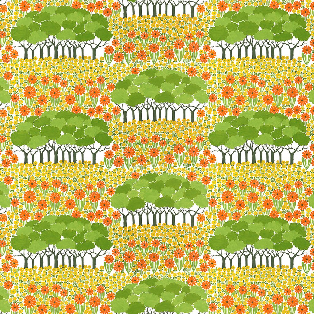 Vaxduk i bomull med akrylbeläggning . Mönstret Allé i gult, orange och grönt.