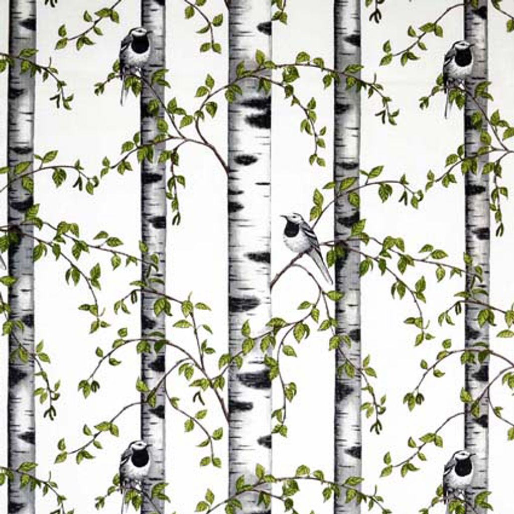 Björkdungen textilvaxduk i bomull med akrylbeläggning med en vit botten och sädesärlor och björkar. Vi skickar tyget ihopvikt.