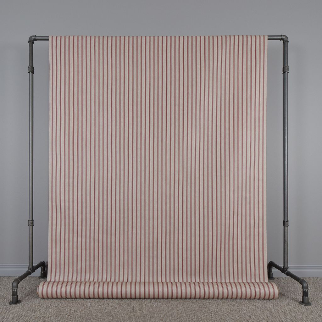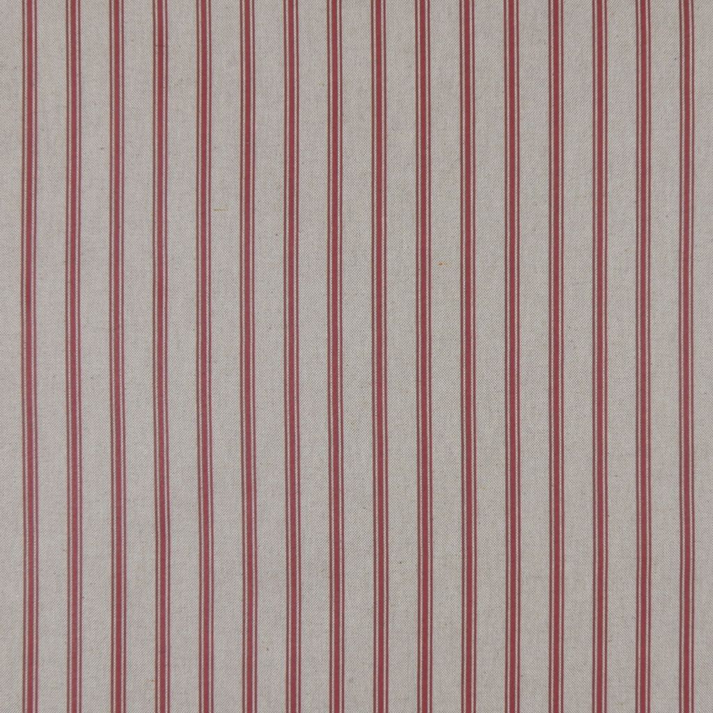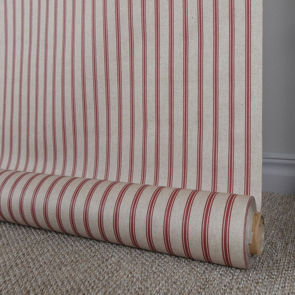 Vaxat tyg på metervara med beige botten och röda ränder i fin linnelook.