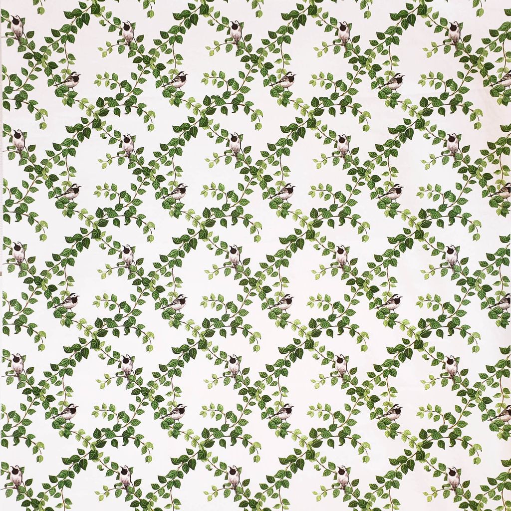 Vacker mönster på offwhite botten med gröna blad och små fåglar. Tyget är akrylat behandlat vilket gör det både hållbart och lätt att rengöra. Vi skickar tyget ihopvikt.