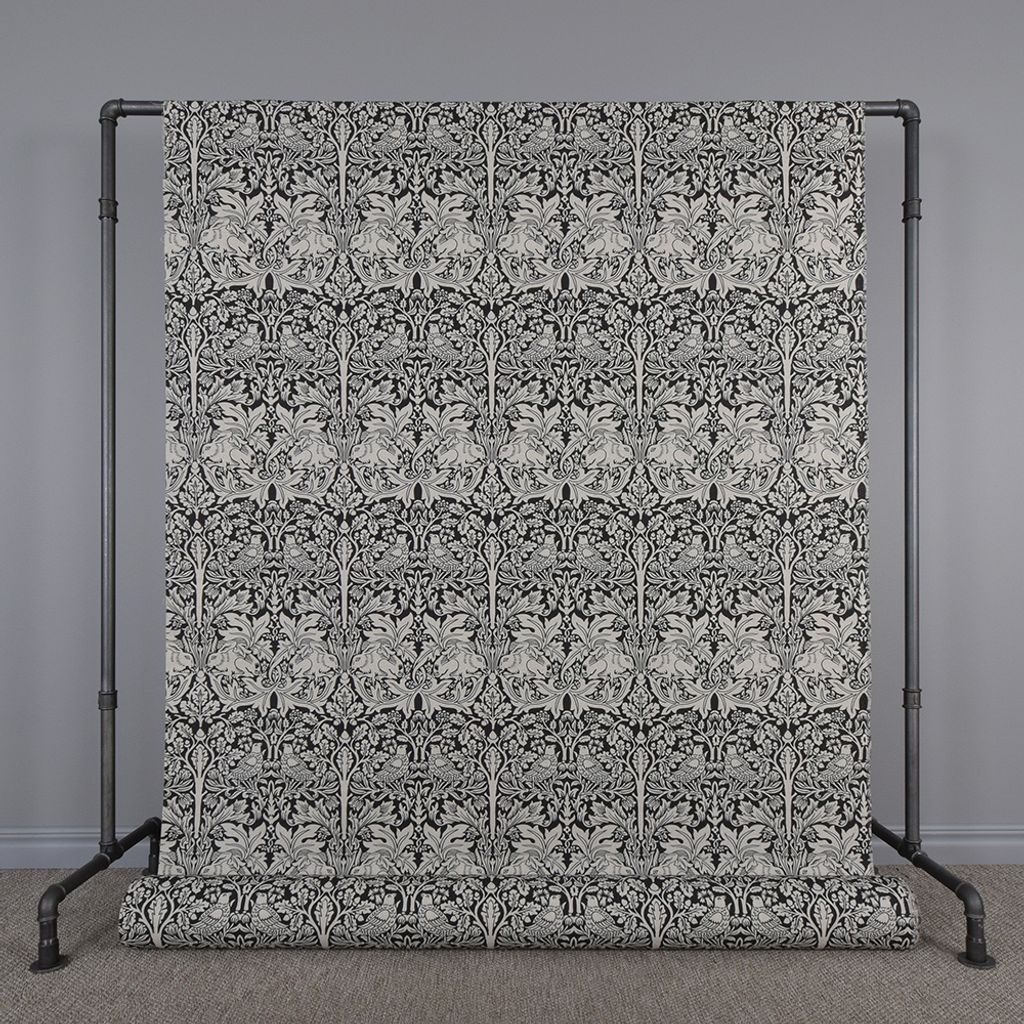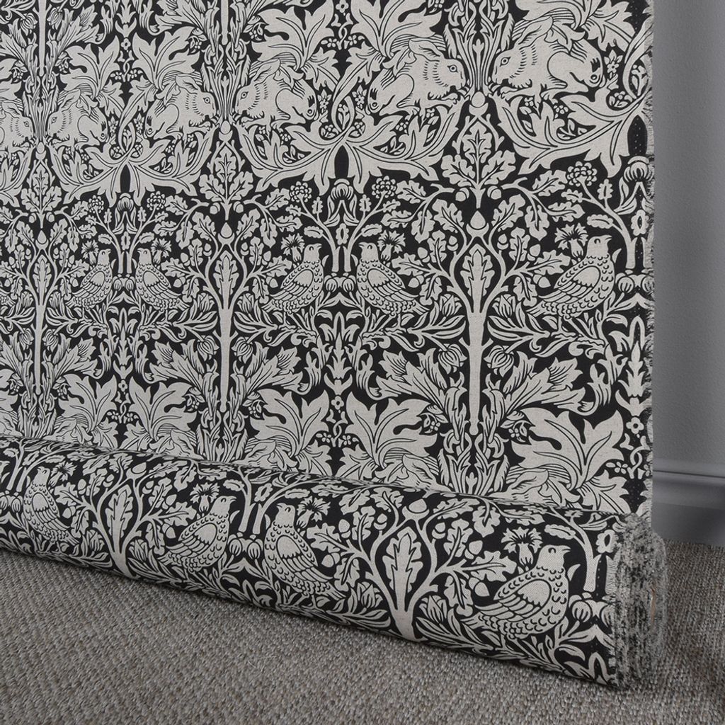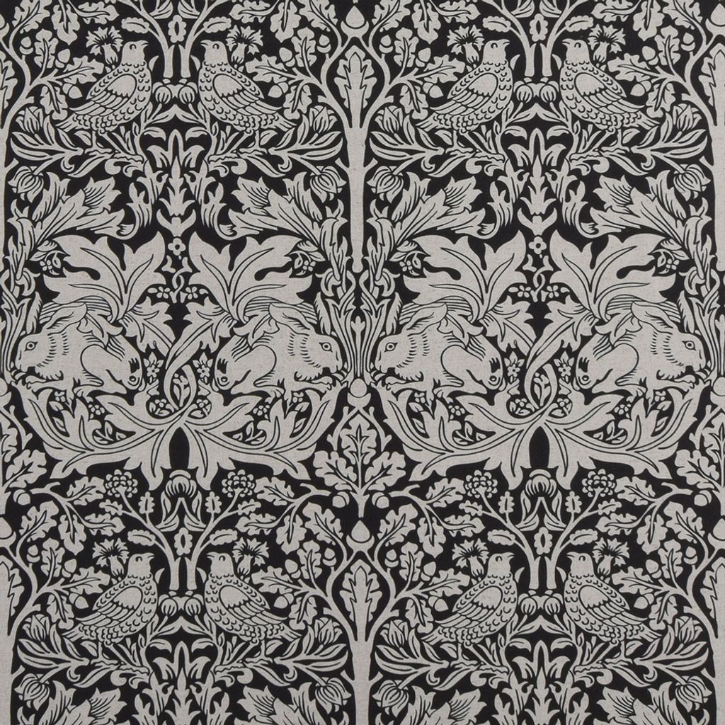 Thalia svart-lin är ett stilfullt tyg inspirerat av Arts and Crafts-rörelsen. Det har ett intrikat mönster av växter, fåglar och harar, tryckt på en linneblandning i svart och linnefärgat tyg. Perfekt för gardiner, dukar eller dekorativa textilier.