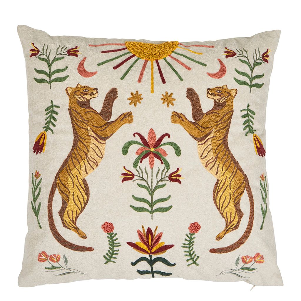 Tiger kuddfodral med detaljrikt broderi av två kraftfulla tigrar på framsidan. En exklusiv inredningsdetalj som förmedlar styrka och energi.