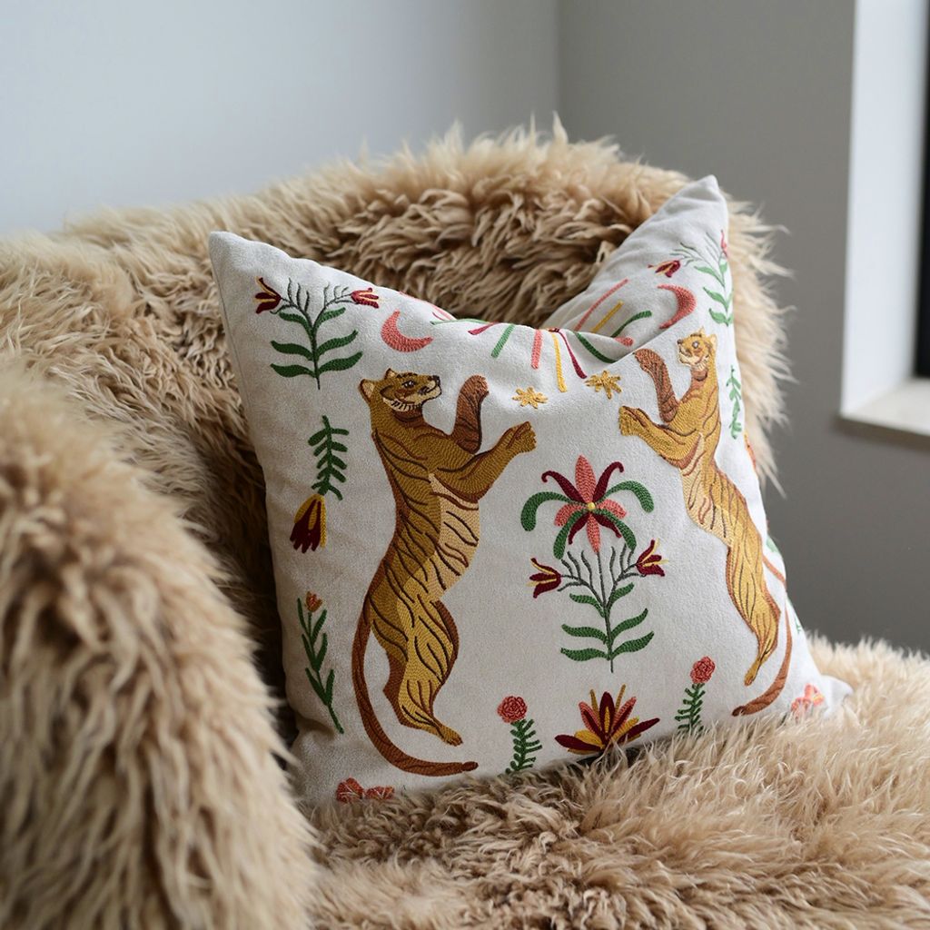 Tiger kuddfodral är ett iögonfallande tillskott till hemmet, perfekt för dig som vill kombinera stil med en touch av dramatik. Framsidan pryds av ett detaljrikt, broderat motiv med två kraftfulla tigrar, där varje stygn framhäver motivets djup och rörelse. Broderiet ger kuddfodralet en känsla av exklusivitet och hantverksskicklighet, samtidigt som tigerparet symboliserar styrka, energi och pondus.