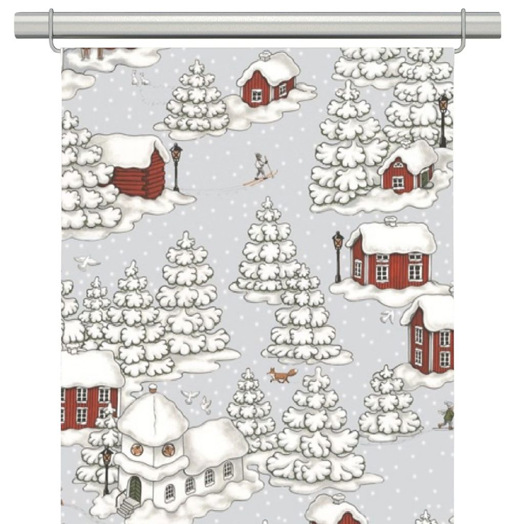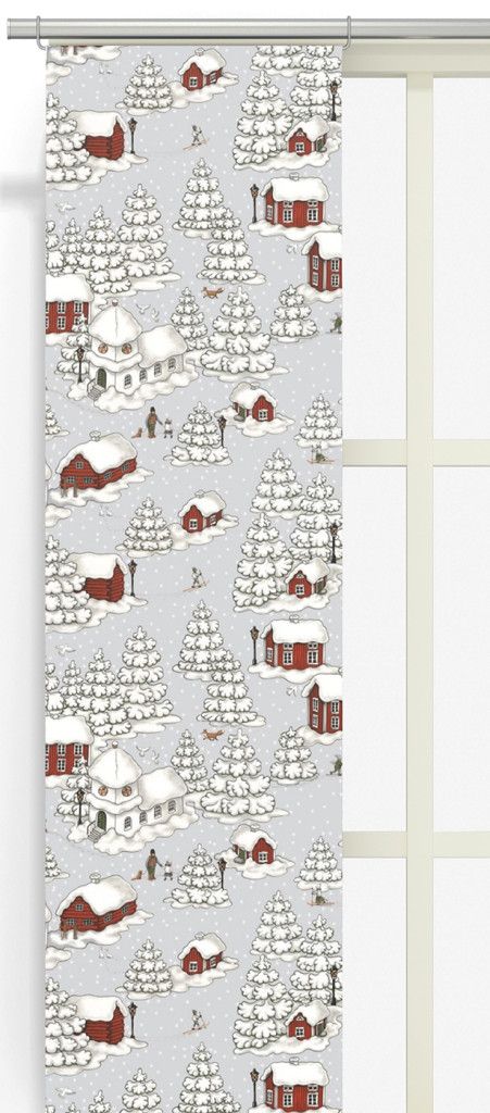 Panelgardiner med julmotiv. Grå botten med röda stugor och en kyrka bland snöfyllda granar.