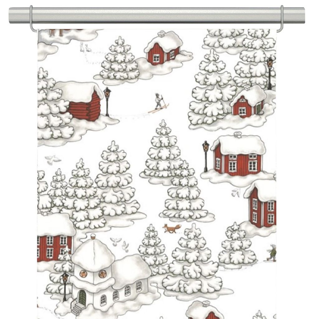Panelgardiner med julmotiv. Vit botten med röda stugor och en kyrka bland snöfyllda granar