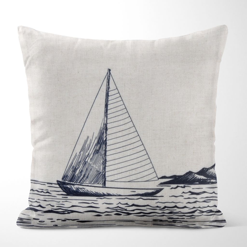 Ett maritimt kuddfodral med motiv av en segelbåt i klassisk handritad stil. Tillverkat i en linneblandning med en naturlig textur och dold dragkedja.