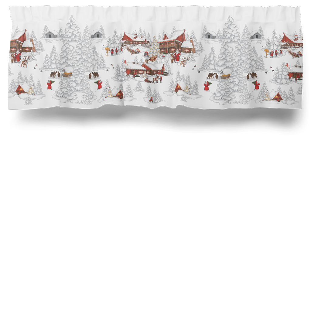 Gardinkappa på metervara med multiband och ofållade sidor. Med Tomtebyn skapa du en magisk julstämning den visar en idyllisk vinterby full av liv. Med tomtar, snöklädda stugor och hästdragna slädar. Kappan är 55cm hög.