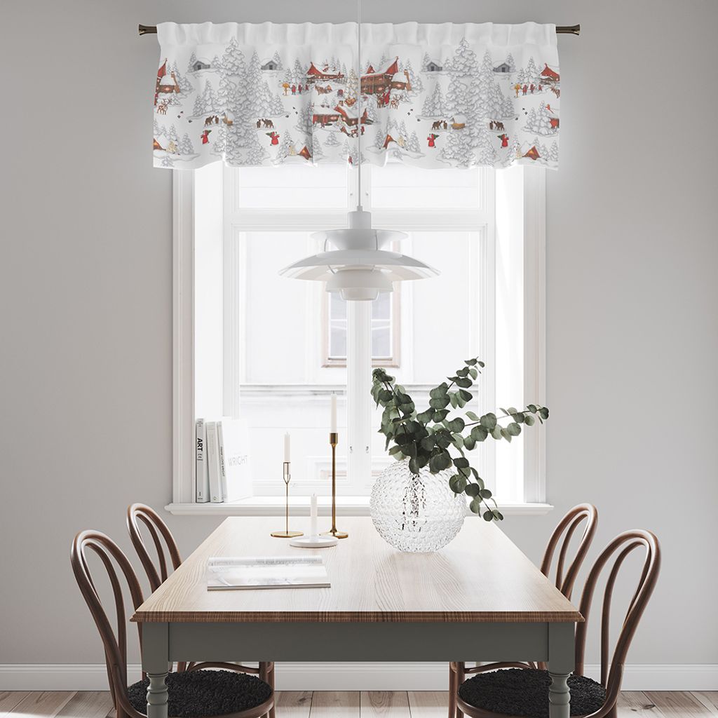 Gardinkappa Tomtebyn förmedlar ett mönstret med en traditionell julkänsla. Detaljer i röda och vita toner fångar en charmig skandinavisk vinteridyll hos tomten.