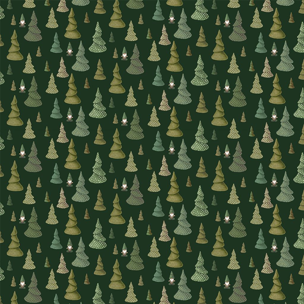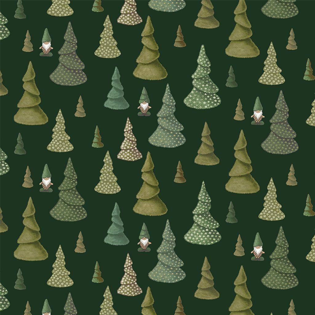 Tomtegömma – juligt bomullstyg designat av MiaLotta Arvidsson-Mars för Arvidssons Textil. Med sin skogsgröna botten och dekorativa granar gömmer sig små tomtar mellan träden – ett charmigt mönster som för tankarna till sagolika vinterlandskap.