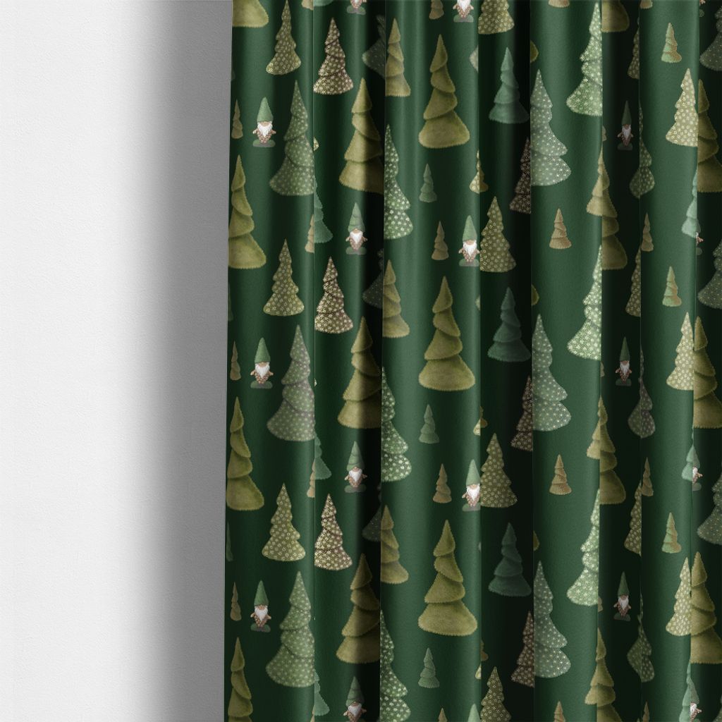 Julmönstrat tyg i grönt med små tomtar och granar – en lekfull klassiker från Arvidssons Textil.
