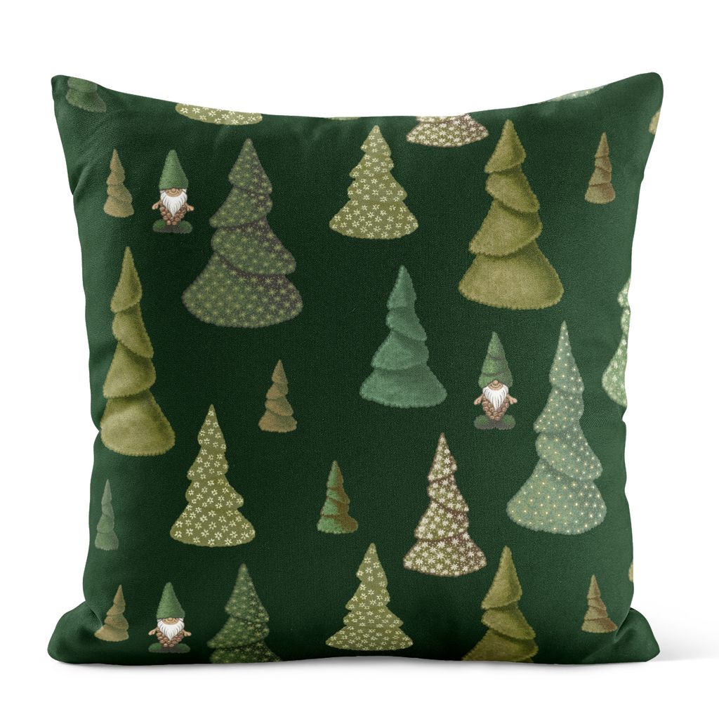 Grönt kuddfodral med granar och små tomtar – ett mysigt julmönster som skapar stämning i soffan! Mönsterplaceringen varierar, vilket gör varje kuddfodral unikt. Innerkudde ingår ej!