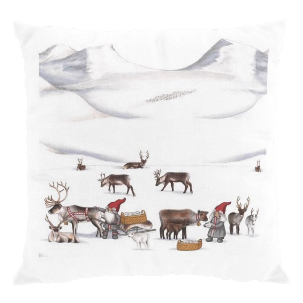 Ett kuddfodral i mönstret Tomteland med tomtar och renar på fjället från Arvidssonstextil. Fodralet är 47x47cm med ett blixtlås i nederkant.