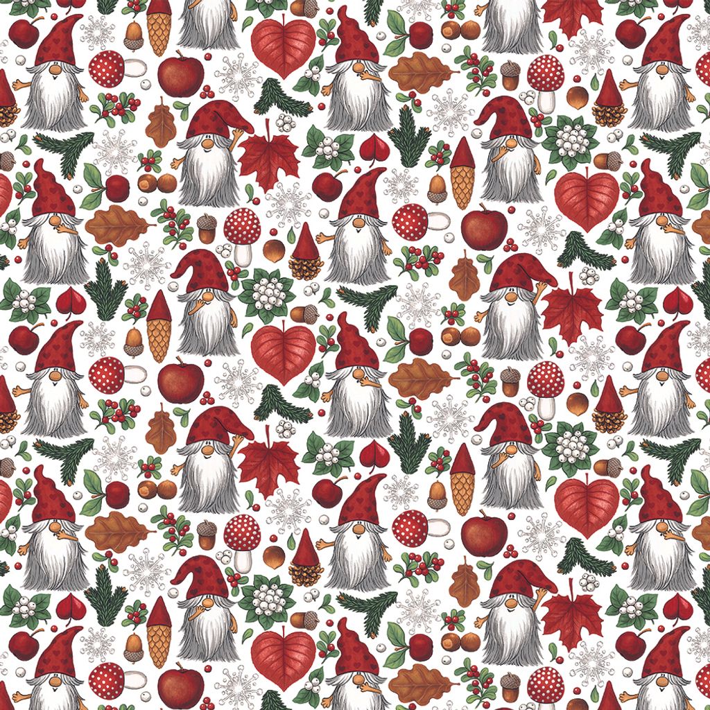 Bordsduk Tomteskogen med söta tomtar i röda luvor, röda äpplen, svampar, vintergröna kvistar, bär, och löv som skapar en förtrollande julskogslandskap.