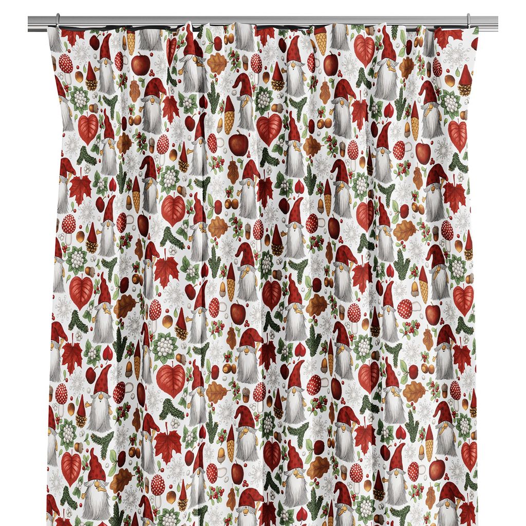 Tomteskogen gardiner har ett mönster fyllt med söta tomtar i röda luvor, röda äpplen, svampar, vintergröna kvistar, bär, och löv som skapar ett förtrollande julskogslandskap.
