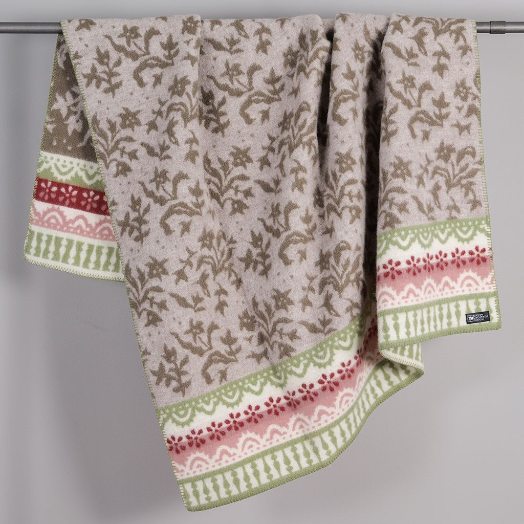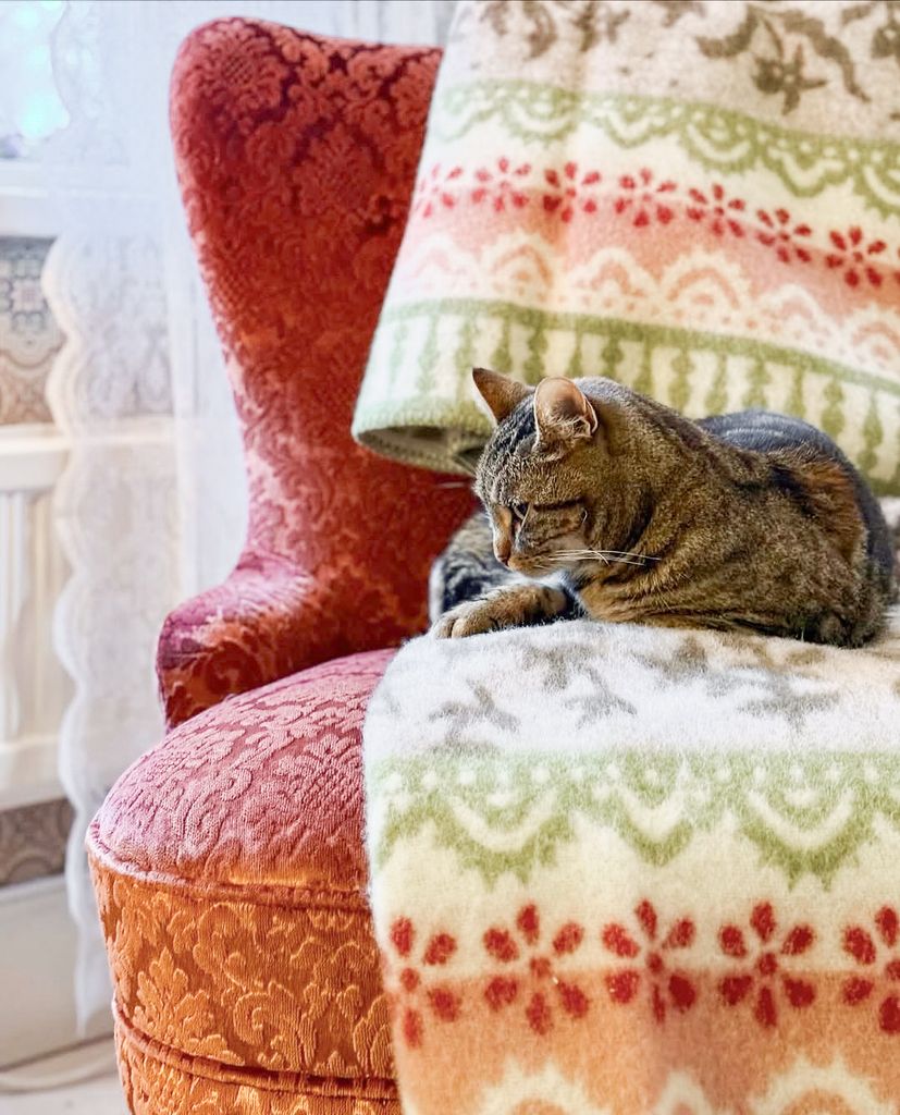 Torpet ullfilt hämtar sin inspiration från den svenska landsbygden – från grönmålade pinnsoffor och pärlspont, till röda pelargoner bakom vita spetsgardiner och storblommiga tapeter från 1800-talet. Det är en design som fångar känslan av sommar på landet, doften av nybryggt kaffe och lugnet i kökets mest ombonade hörn.