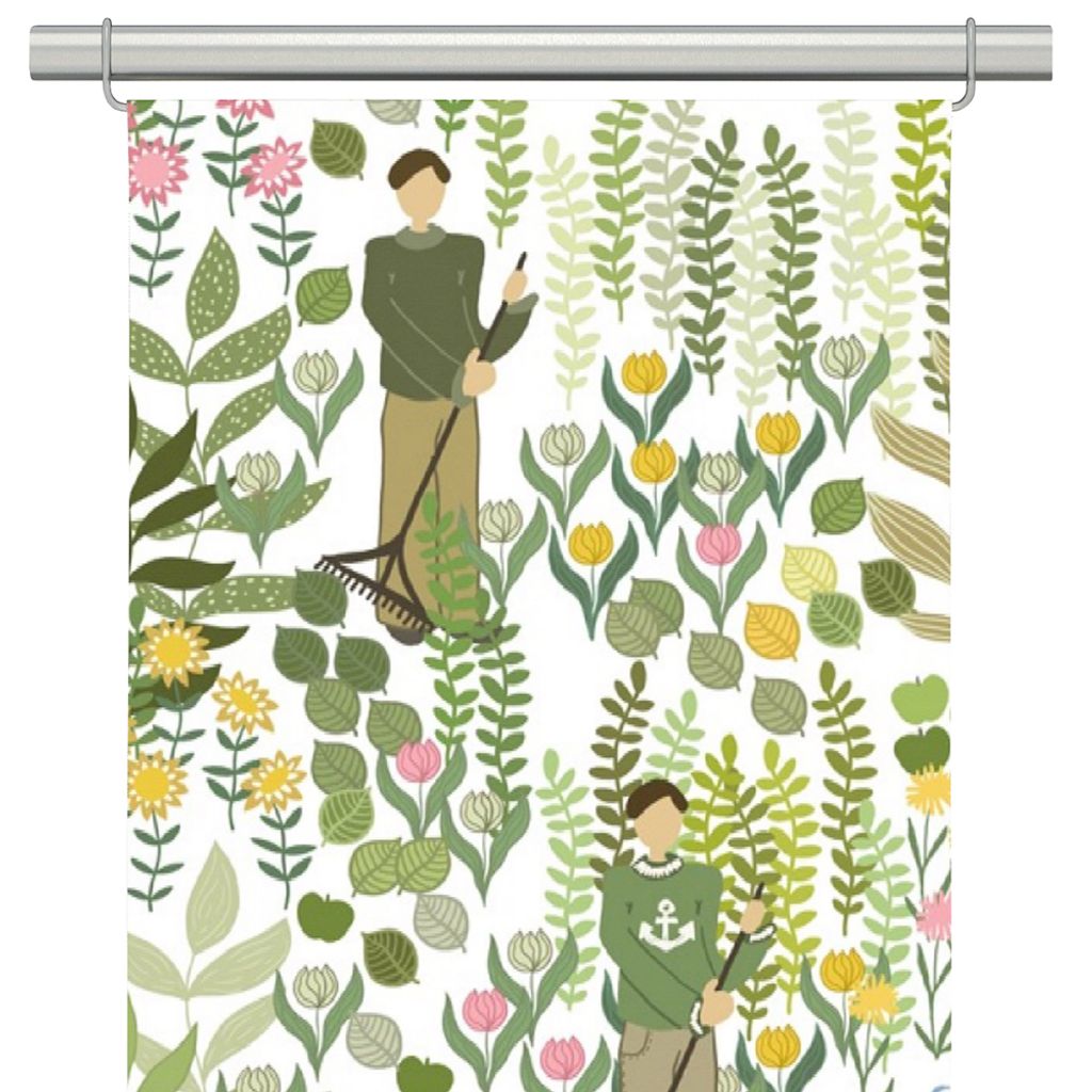 Vita panelgardiner med människor som påtar i sin trädgård i pastelliga gröna och gula färger.