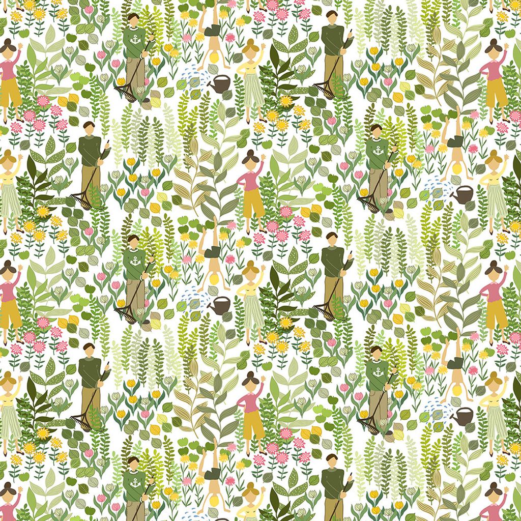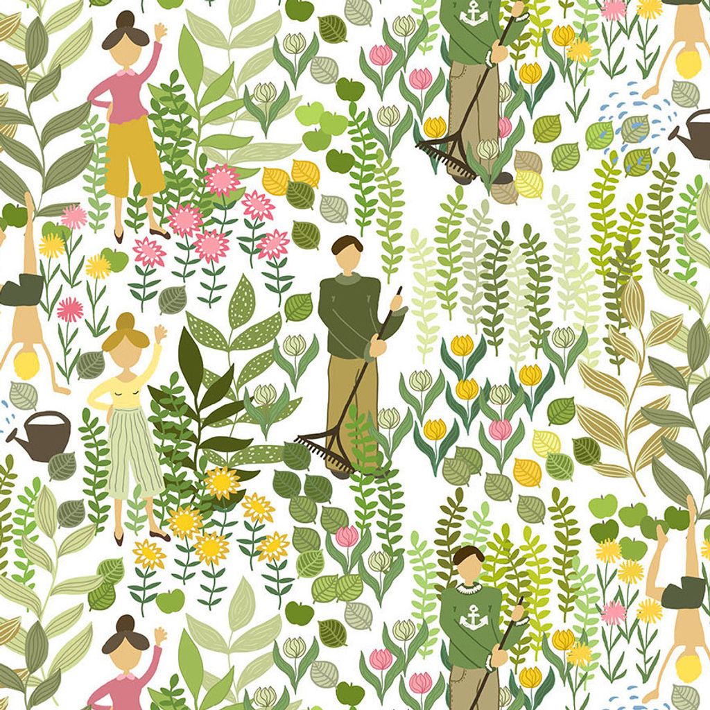 Bomullstyg med vit botten och mönster likt en grönskande trädgård i härliga färger.