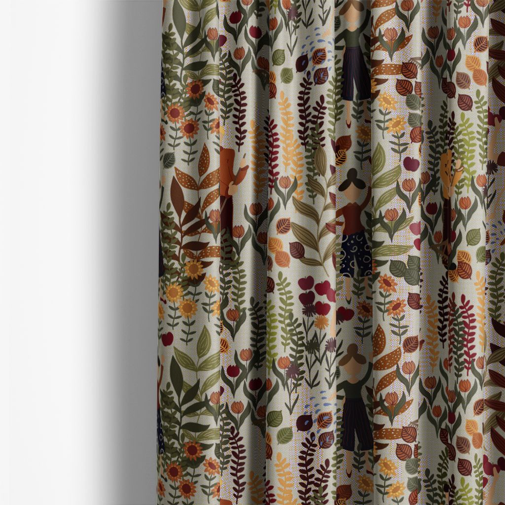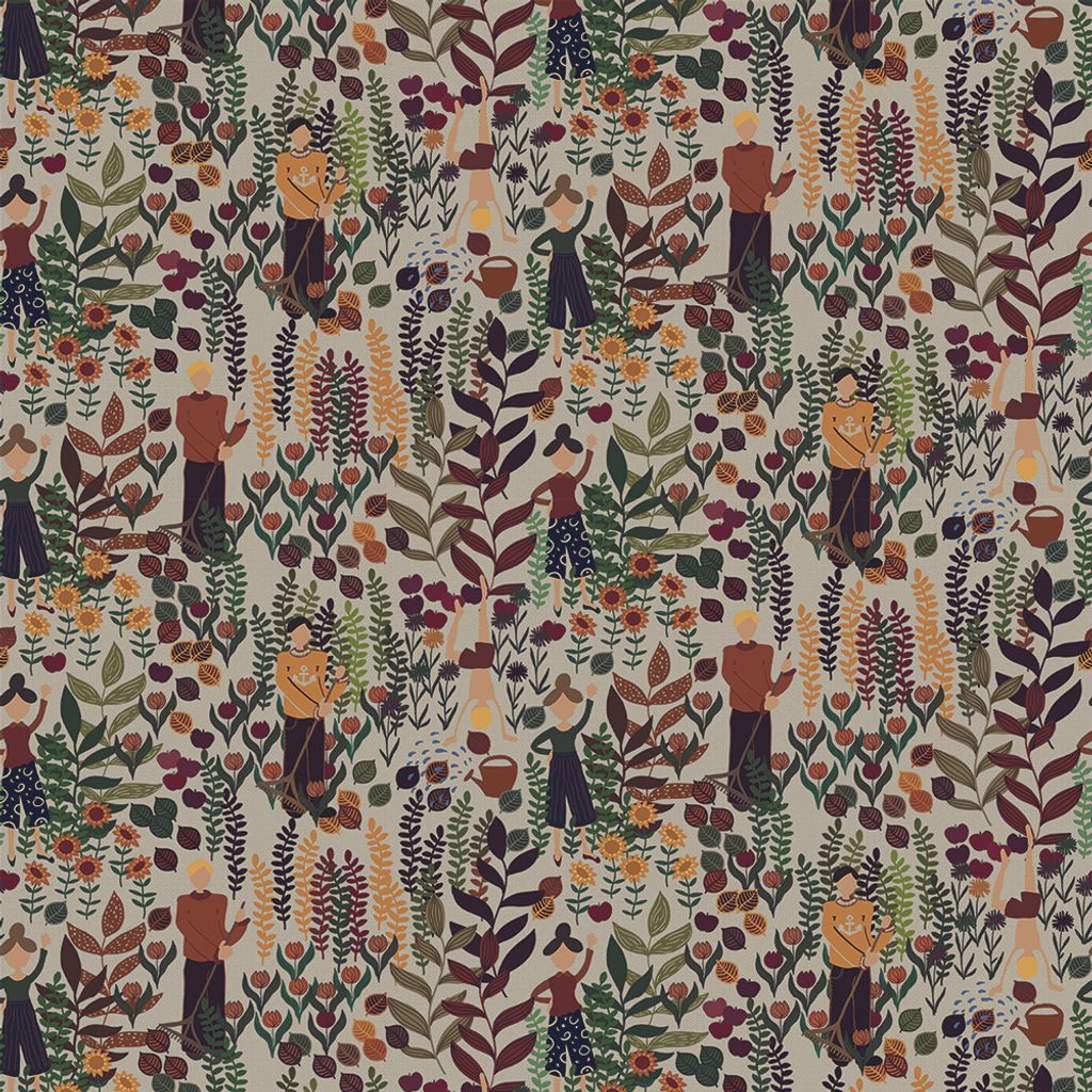 Tyget har frodiga växter, färgglada blommor och figurer som verkar vara engagerade i trädgårdsarbete eller njuter av naturen.