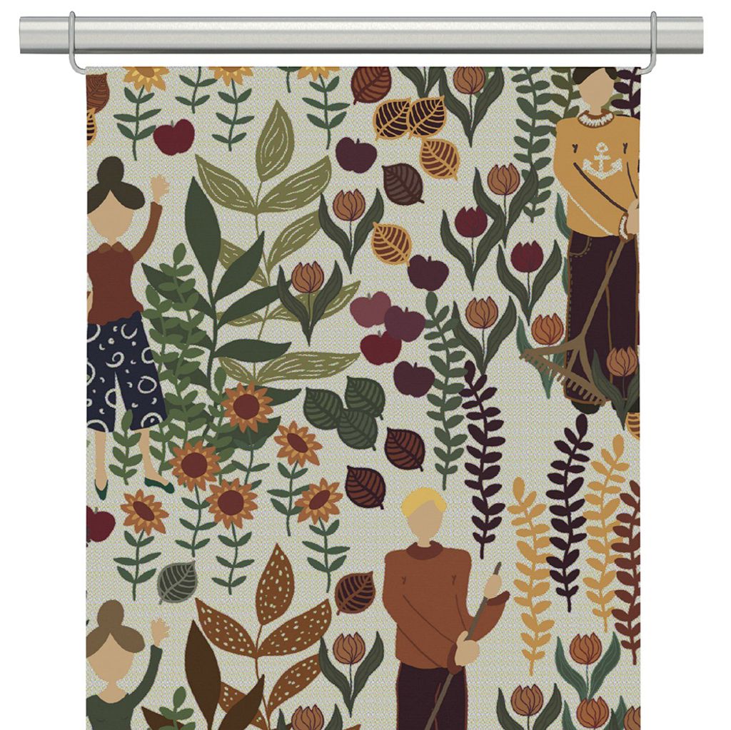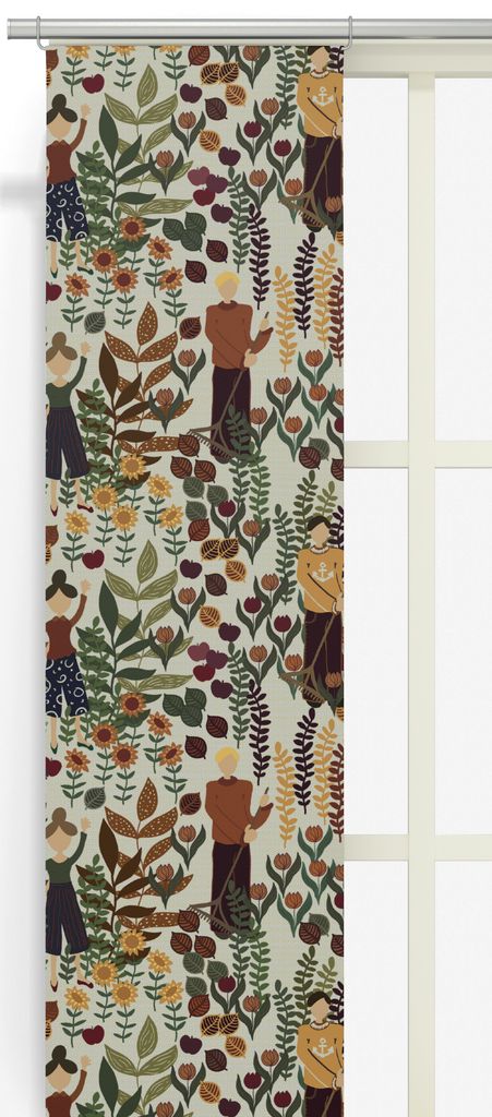 Lägg till en känsla av rustik charm i ditt hem med Trädgård rost-beige panelgardiner. Dessa panelgardiner, med en linnefärgad botten, pryds av ett rikt mönster som föreställer blommor, blad och människor som arbetar i trädgården. De varma tonerna i rost, beige och grönt harmonierar för att skapa en inbjudande och livlig miljö, perfekt för den som vill ha en avslappnad men ändå stilfull inredning.