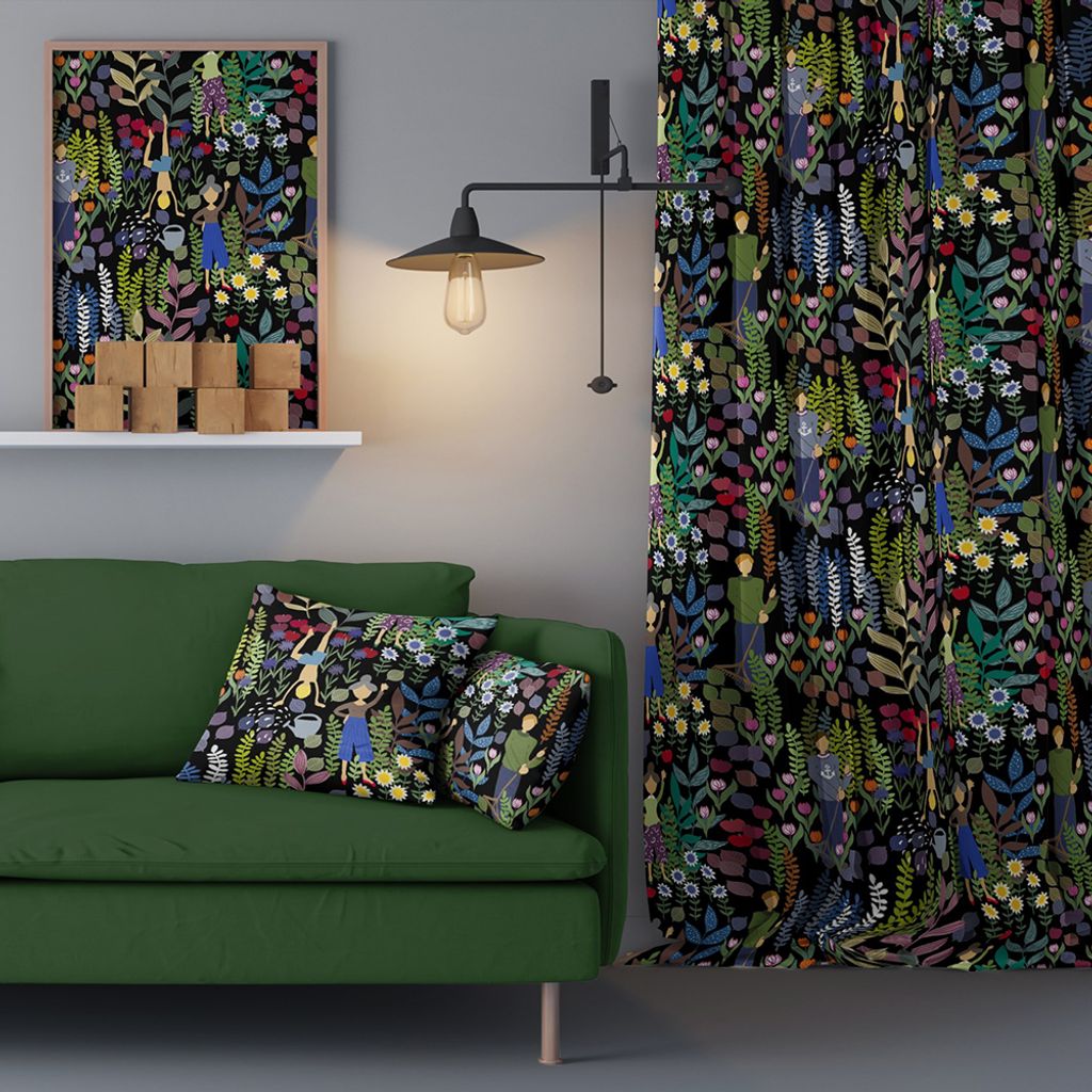 Svart botten och mönster likt en grönskande trädgård i härliga färger.
