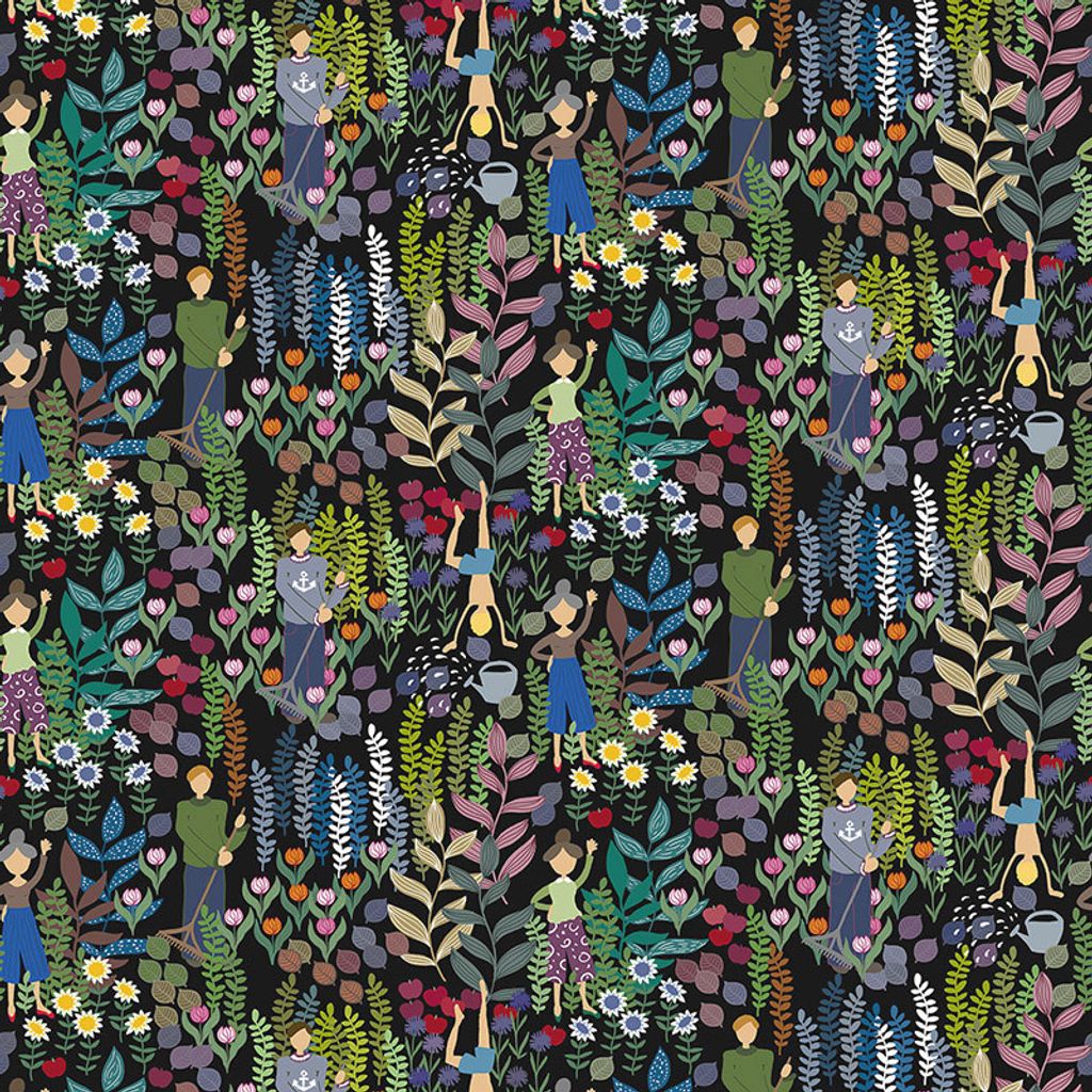 Bomullstyg med svart botten och mönster likt en grönskande trädgård i härliga färger.