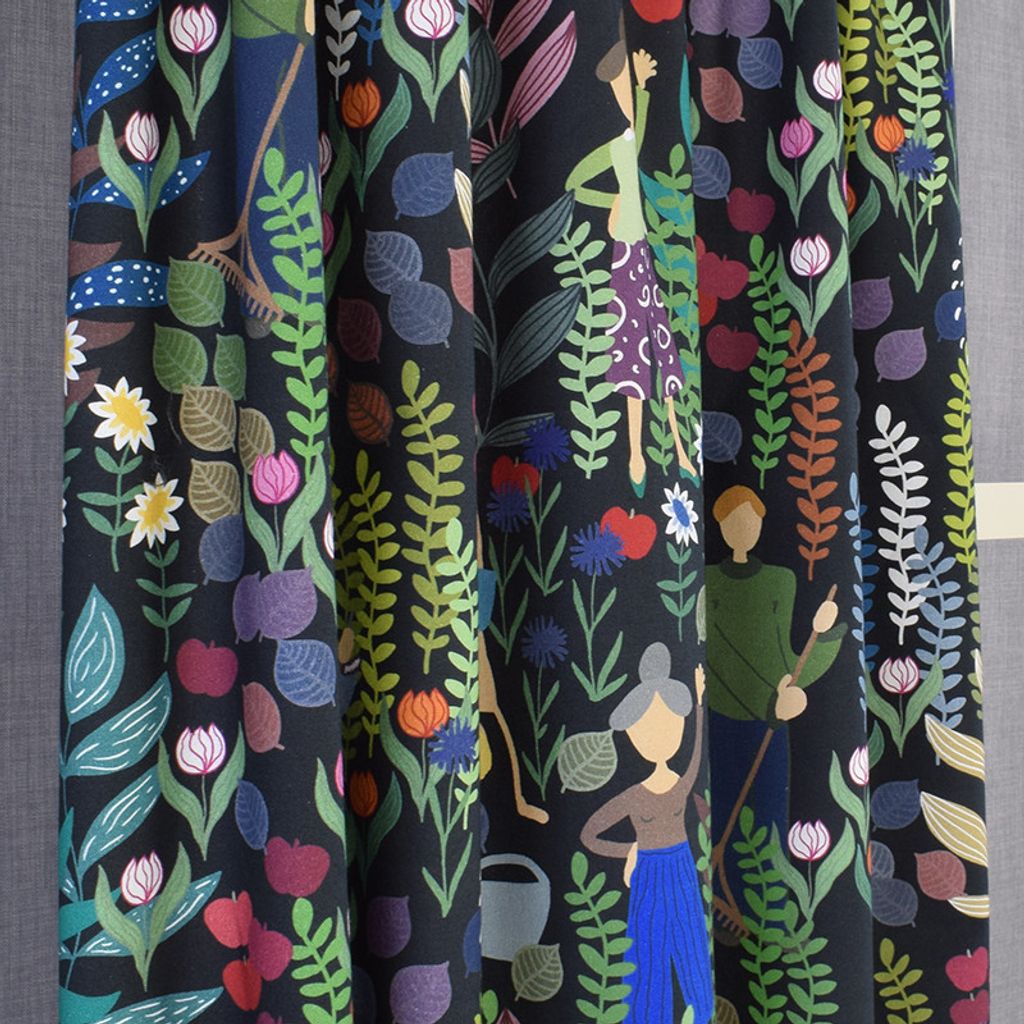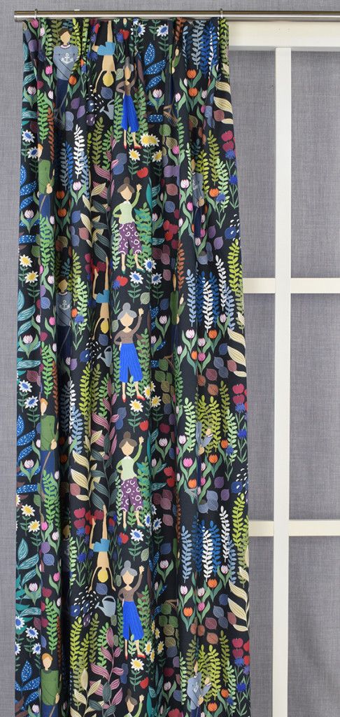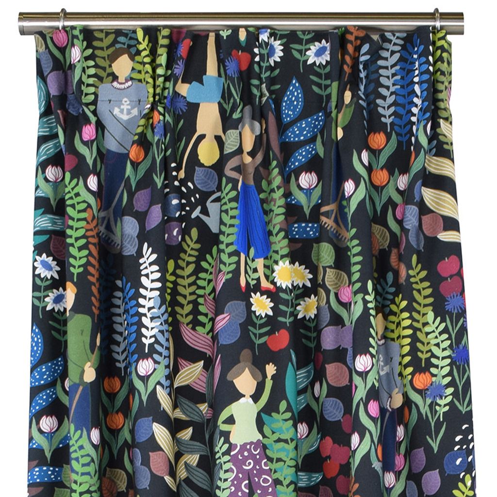 Gardiner med svart botten och mönster likt en grönskande trädgård i härliga färger, design Louise Videlyck.